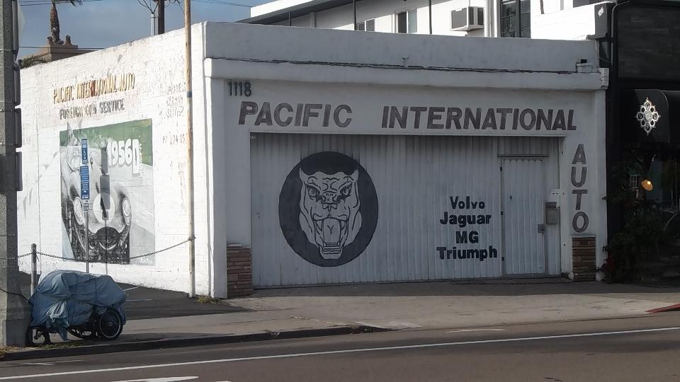 When leaving Greg's place, given a choice of three different routes MapQuest did the right thing and sent us up through the twisty hilly scenic route over the highest hill in La Jolla. On the easy roll down the hill we got a nice view of the city and the ocean front with light rolling surf. When we got to out next WiFi spot we blundered into this little "shoebox shop" across the street, Pacific International Auto, 1118 Garnet Ave, San Diego, CA. Closed on Sunday, but apparently a currently going concern, as it is listed in a few business directories.