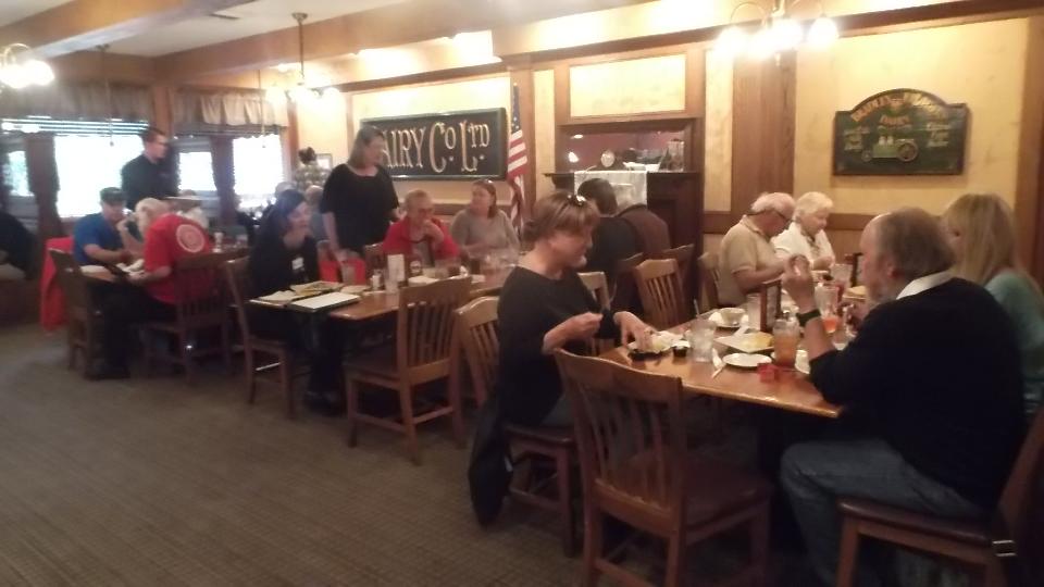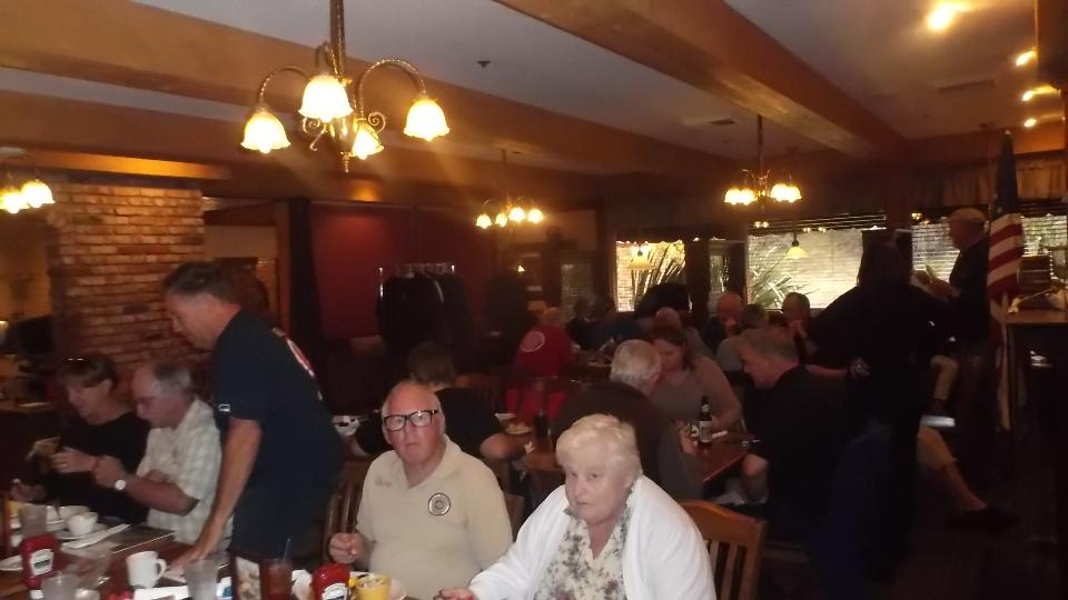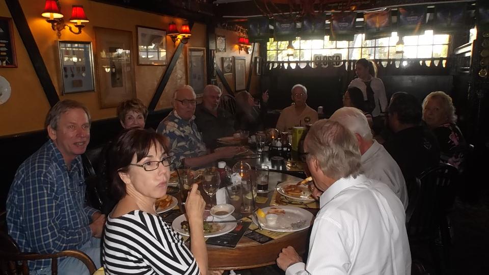 Funny I don't see any T-types here but there are a couple of British vehicles present, one MGB and one London Bus (resident here I presume). Inside we find a dozen members of the Vintage club half through dinner. Now I'm thinking service must be very good if they met at 6:30 and had the food already so we find a seat and order up. We got the drinks in short order, had to wait a bit longer for food. By the time we were half through eating everyone else had left. Seems they mostly arrive between 5:30-6:00-pm, eat early and leave early, having an appointment to watch Dancing With The Stars. Someone should tell us these things maybe? That was a rather long trip to end up eating dinner alone. We could easily have traveled and arrived a bit earlier.