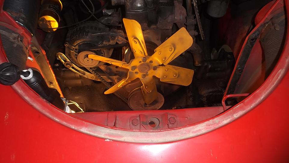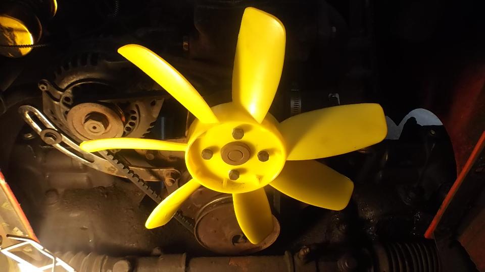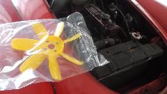 Then with a couple hours to spare it was time to install that new plastic fan. Pity I couldn't have done it a week or two earlier when we were still in the severe heat in Arizona, but better now than never. Must first drain and remove the radiator to have access to the fan. While the fluid was out I changed the thermostat from 195dF to 180dF, figuring I won't be tooling around in Chicago winter weather in the near future.