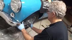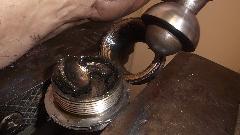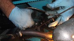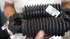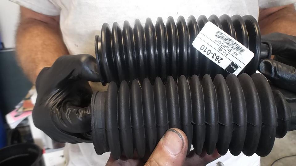 Here we have a comparison of the new gaiter and old gaiter. New one=14 convolutions. Old one=13 convolutions. If I remember right, original ones had 11 convolutions, so neither of these is concours correct. Since the old ones appear to be in good condition (and might be more robust than the new ones), we elected to reinstall the old ones and keep the new ones for spare parts. That and the fact that the old boots would accept the metal band clamps on both ends. The new boots had a narrow groove on the inboard end which would only accept a nylon tie wrap. Before installing the small end clamps we used a trigger pump oil can to inject 6-oz of gear oil into the left side boot. Then we installed the clamps and pushed the rack from lock to lock a few times to distribute the oil through the assembly. You know you have enough oil inside when you can hear it gurgle in and out of the boots as it moves. This was followed by a brief victory whoop, something like, "Yee-Haa"!