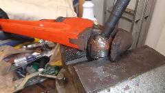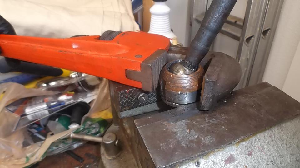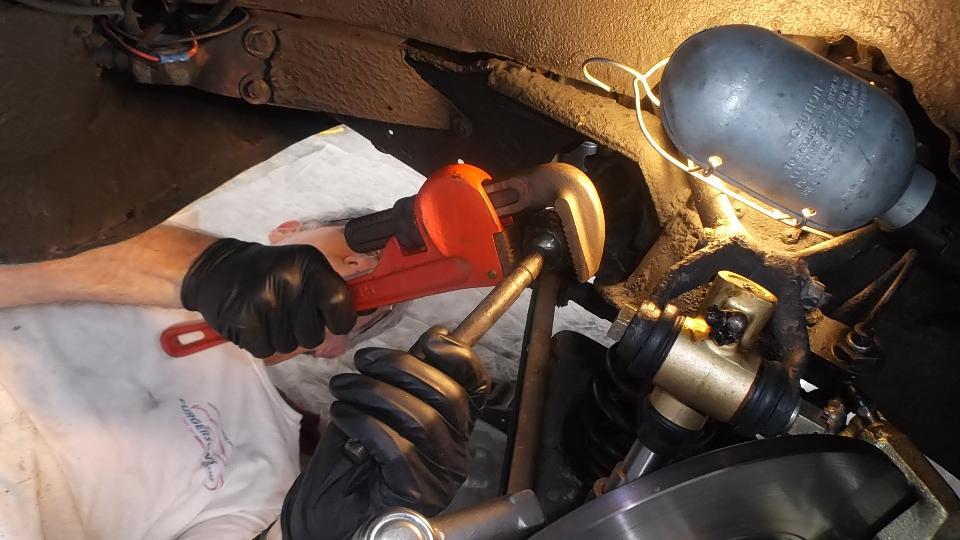 This was to be Steering Rack Tech Day for Scott's MGA. We had the intention to remove some wiggle from the inner tire rod ball joints. I have done this before a couple of times. It was once difficult and once much worse so I was a bit apprehensive. We got an early start allowing for the idea that a three hour job could easily turn into a 9 hour job. Get the car on jack stands and remove the front wheels. Loosen clamps on the steering rack gaiters, loosen jam nut on the tie rod, and unscrew the tie rod from the ball end joint, counting the turns to disassembly. Unlock the lock tab washer (cup) using a thin screwdriver and mallet, three places. Then unscrew the inner ball joint from the gear rack. So far so good (that was the easy part). Take the tie rod assembly to the bench vice, clamp the thin socket flange in the vice jaws, and unscrew the large acorn nut with a pipe wrench.