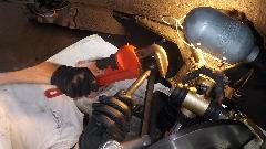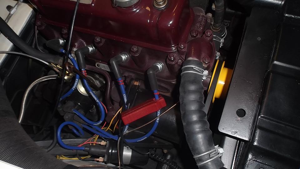 Front carburetor was running rich, while the rear carb was definitely a bit lean. After a few minutes of carb adjustment it ran well, but ignition timing was suspect. A stated 7 degrees static timing turned out to be 7d with a strobe light at 1000 rpm (probably a bit less static). High speed check with vacuum disconnected showed only 23d advance at speed. After resetting timing to 32d BTDC at speed, idle timing was 16d at 900 rpm. Not by the book, but functionally very good. With vacuum connected it made 46d at speed, the extra 14d due to vacuum unit, good for cruising speed fuel economy. Another small tweak on the carbs, then time for a test drive. Trip around the block began with a big grin, developed into a few extra miles, and ended with a bigger grin. I think we did something right. Late night chat turns to later night computer work, so we will be a bit short on sleep tonight.