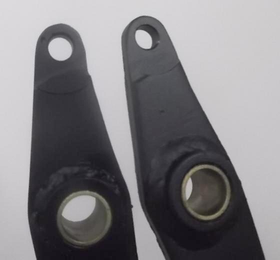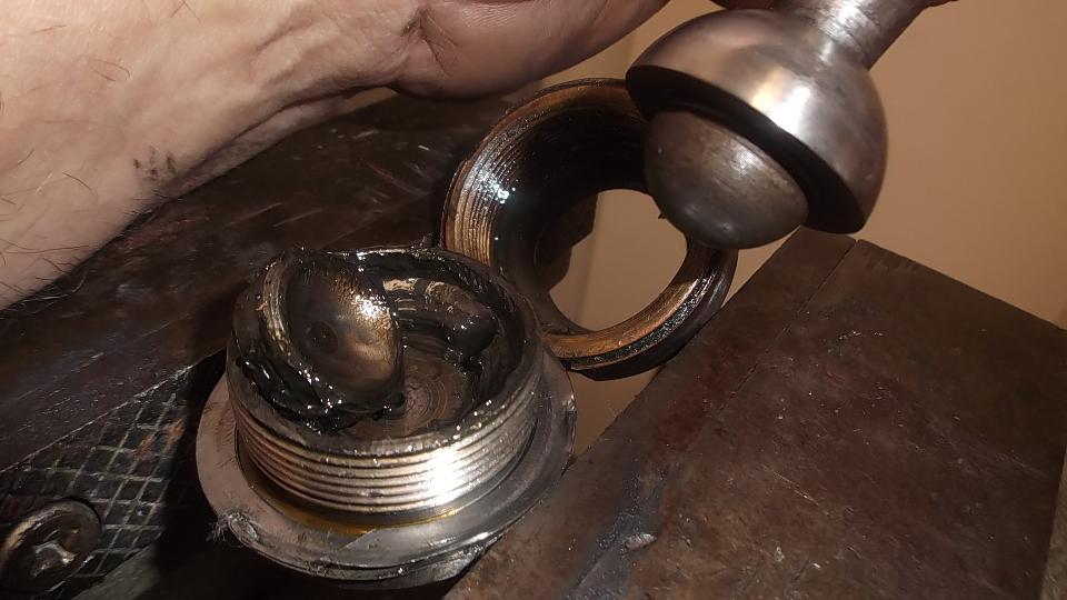 This is the point where the job sometimes takes on a new life, requiring liberal application of the Blue Wrench (acetylene torch) before the nut comes loose. This time we were blessed with good luck as both left and right side ball joints came apart on the first try with the pipe wrench alone. Wonders never cease. The first one had two shims, 0.010+0.003=0.013. We had in mind to take out about 0.004. First selection was to be one 0.010 shim. The new replacement shims were plastic (maybe Delrin), and I thought it might compress little when clamped in place. This turned out to be a good choice, as it snugged right down to zero clearance and a slight preload as the acorn nut was tightened. Score one for the good guys. The second joint was a tad looser to begin with, and it contained three shims 0.006+0.006+0.008=0.020. Here the new selection was one 0.010 plastic shim combined with the existing 0.008 shim for 0,018 total. Again score one for the good guys, as it pulled up snug with zero clearance and slight preload on the first try.