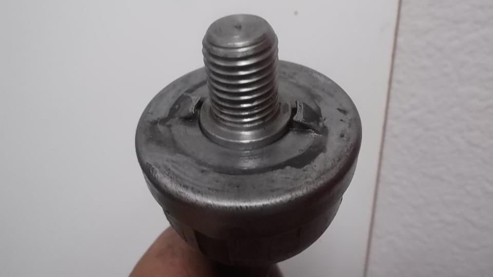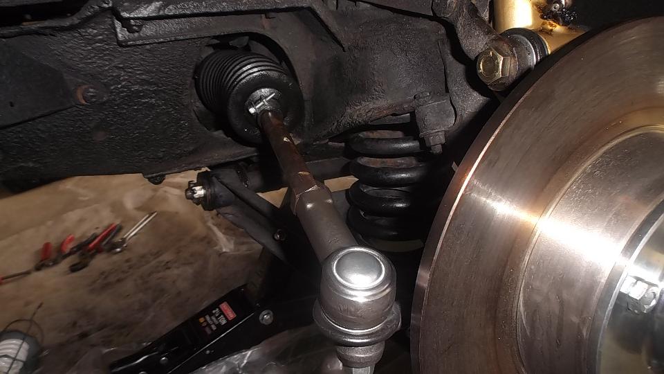 Back to the car, hold the lock tab cup in place as the ball end is screwed into the rack. Pull it up tight, and set the lock tabs into the slots with a hammer and punch. Easy peazy. Install the rubber gaiter with clamp on the inboard end only. Screw the jam nut onto the tie rod, and screw the tie rod into the ball end the same number of turns as was required for disassembly, and tighten the jam nut. Ditto for the second side.