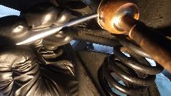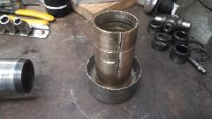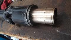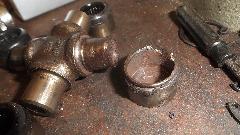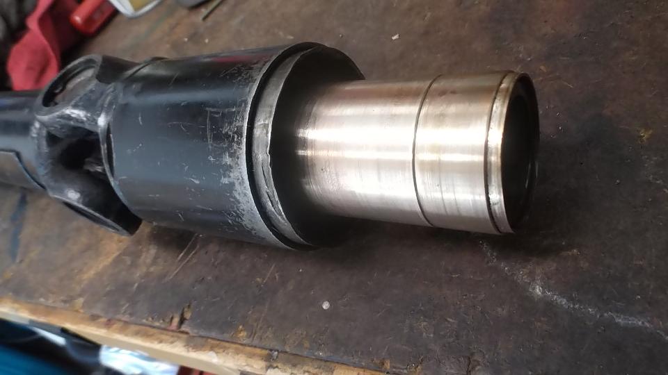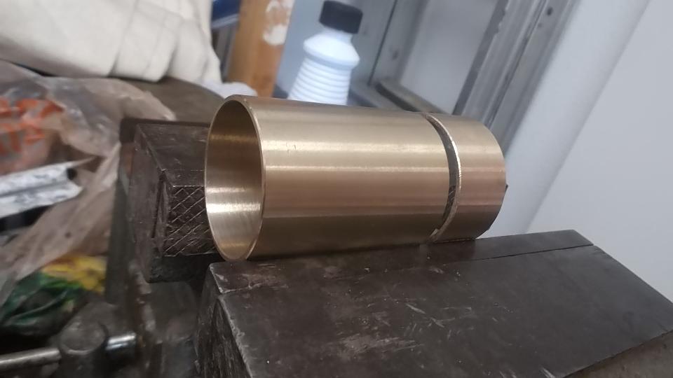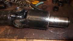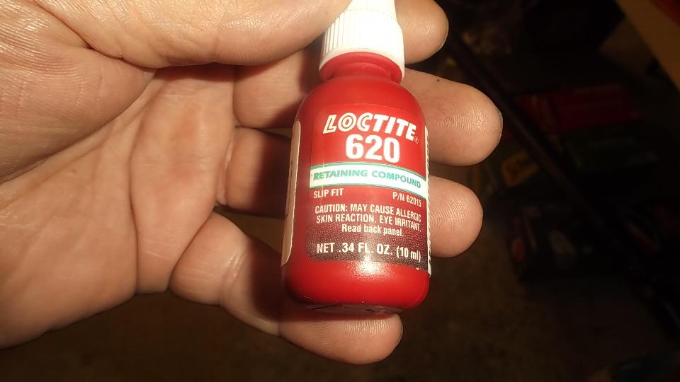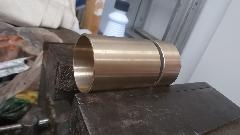 Ah-ha! The Loctite 620 bearing set adhesive and the bronze bushings are here by mid day. Prepping the bushings first. Required bushing size is 1-3/8" ID x 1-1/2" OD x 2-3/4" long. But off the shelf parts are not available that long. So I bought three pieces 2" long, then cut 3/4" off each end of one piece to have two useful sets. The idea is to press the 3/4" long piece and the 2" long piece into the tail housing end to end to have the 2-3/4" length required. Got the car jacked up and set on stands, crawled underneath, and swabbed out the tail housing with rag and solvent a few times over to be sure the bore was clean, and gave it some time to dry. Under the car again with tools in hand, slobbered some adhesive on the bearing OD short piece first, and taped it gently into the housing driving it half way in using the old loose bushing as a driver punch. Slobbered more adhesive on the longer bushing, and taped it gently into the housing.