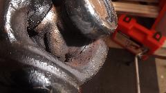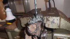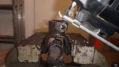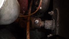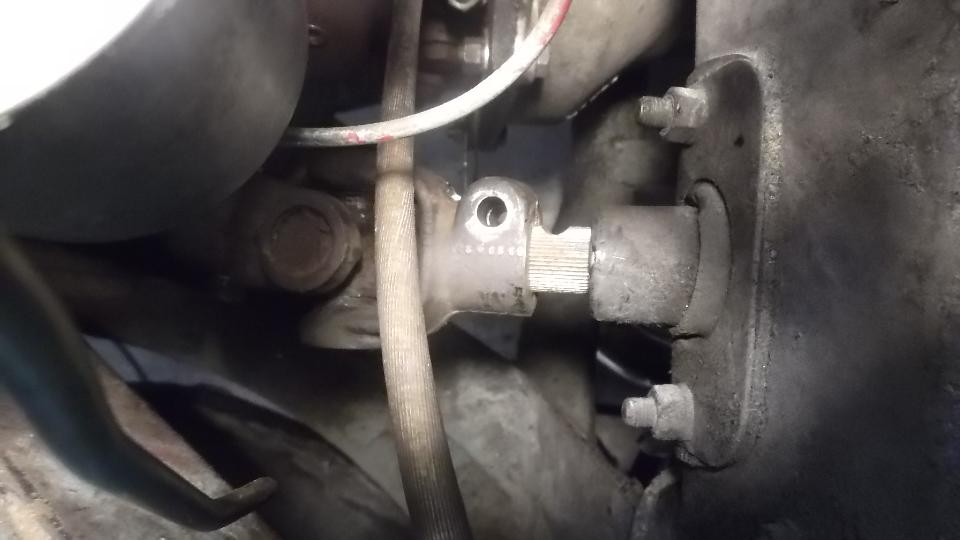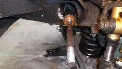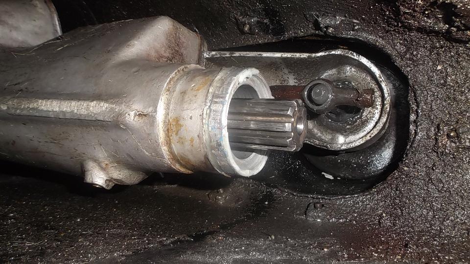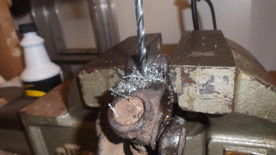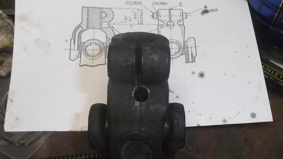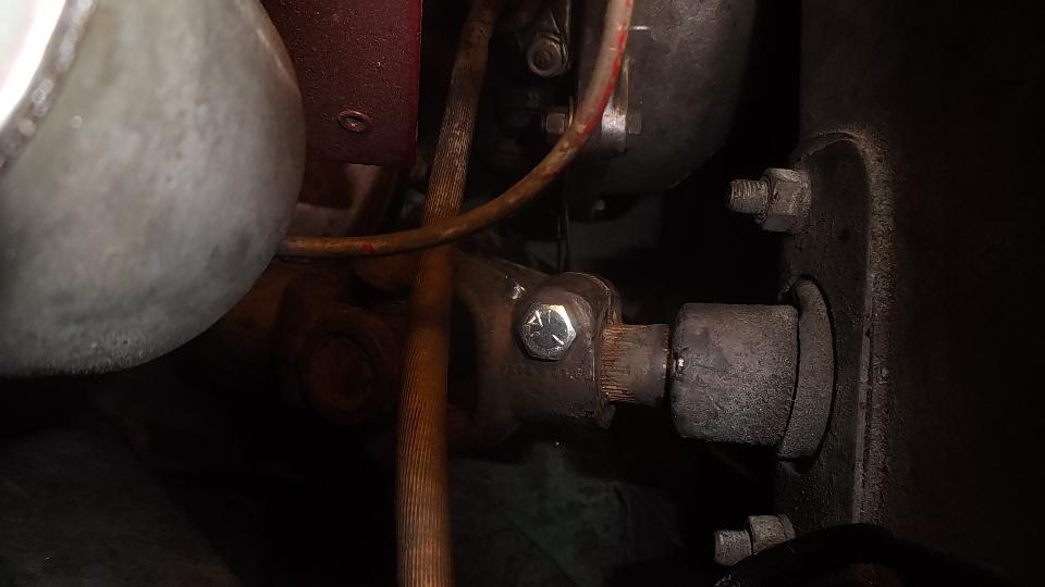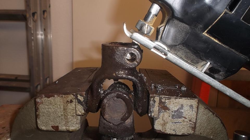 Since the ball joint rebuild went so well, and it was still early afternoon, we elected to continue with a couple more steering improvements. The U-joint in the steering column was a bit loose on the upper splines, So we printed out the factory Confidential Service Memorandum and proceeded to modify the U-joint for tighter fit on the splines. Remove two pinch bolts and pull the steering column up to release the U-joint. Easy enough. Holding the U-joint in the bench vice, drill a 5/16-inch hole, and saw cut from the original slot into the hole. Just a bit of grunt work, but that went okay. Ditto for the second end of the U-joint. Then reinstalling the U-joint was a bit of trouble, as it has very fine splines making it difficult to fit exactly back to the original position so the pinch bolt would go through. In the process we bugger the thread and had to replace one bolt (which graciously came out of the magic trailer). This was supposed to be the easier job, but turned out to give the more difficulty.
