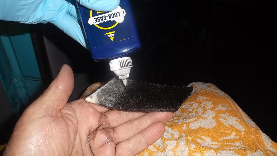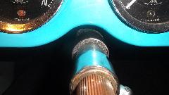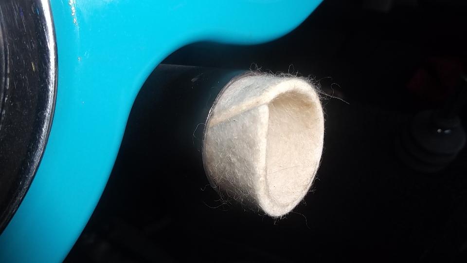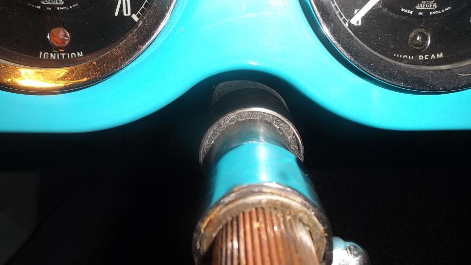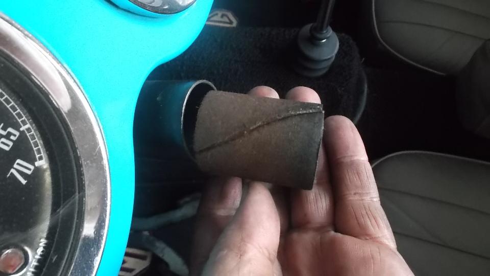 Ah, but we still had a bit of daylight, so on to the next improvement. It was time to replace the felt bushing on the top end of the steering column. A few minutes to remove the steering wheel so the shaft would pull out of the tube. Then a short trip to the hardware store to pick up a bottle of graphite lube (Lock-Ease brand name). Shake, shake, shake, and then saturate the felt bushing with this stuff, and pat dry with a paper towel before installation. We are happy to report perfect fit for this felt bushing easy installation, and no more slop in the top end of the steering column.