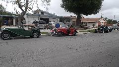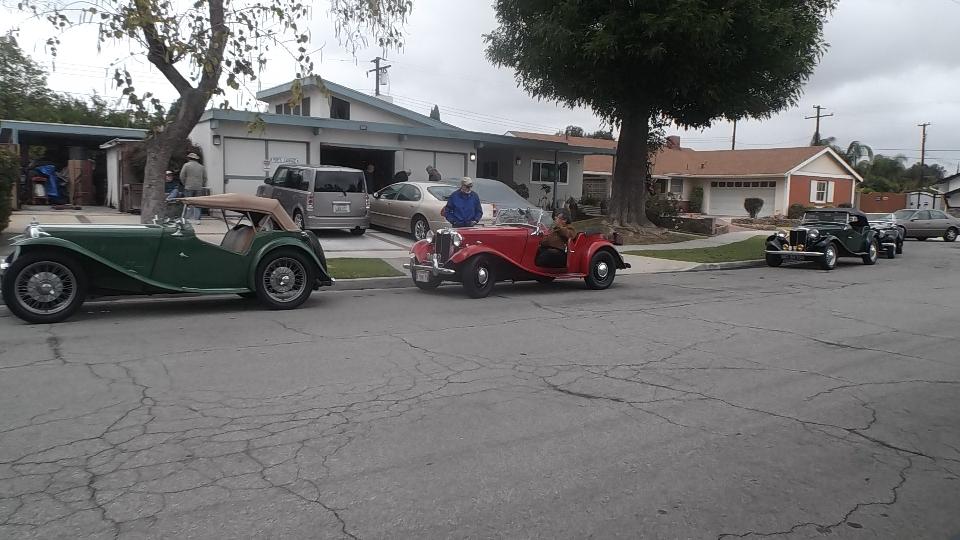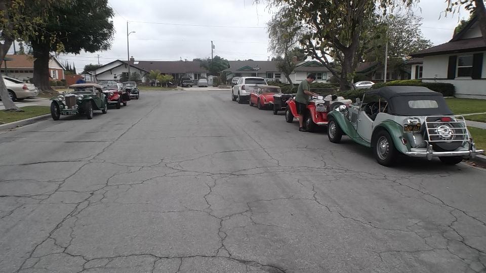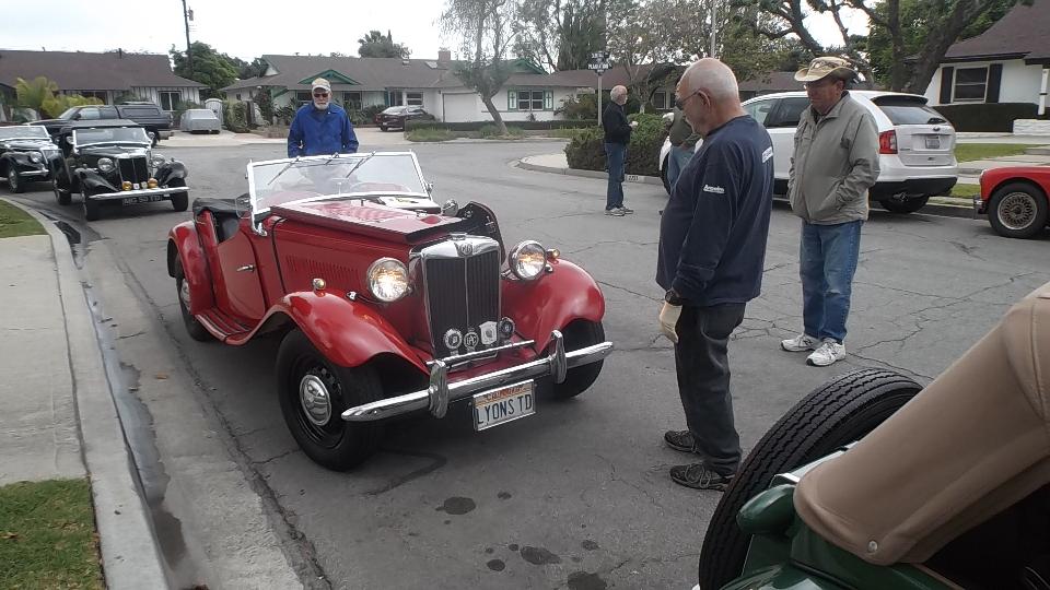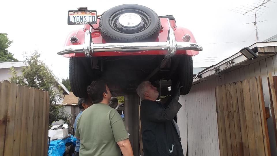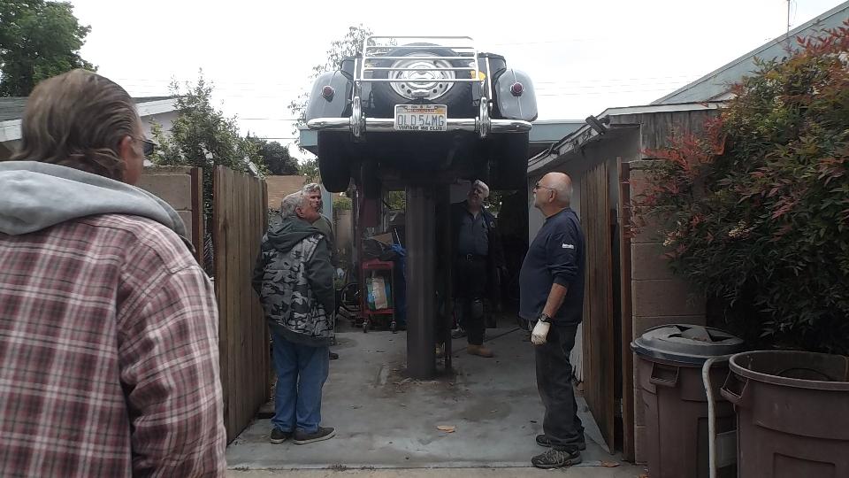 Tech day today at Vintage MG Club of Southern California. 21 miles north on I-5 and 21 miles west in US101. This was to be Safety Inspection for several MG TDs at the home of Jerry & LaVerne Felper in Anaheim. How many people have a single post hydraulic lift in their side yard? If I counted right there were seven T-types, one TC, four TD, and two TF.