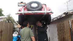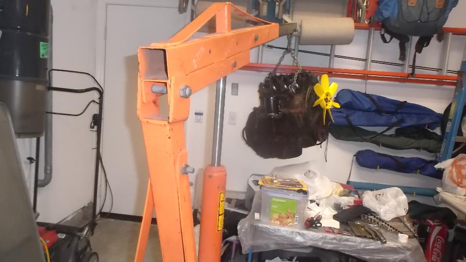 No sense wasting time, so get the car jacked down off the stands and start removing center carpet and tunnel cover and the shift extension from the gearbox. Having cooled off a bit by then, I made a few phone calls to locate an engine hoist. First rental shop had two out for repairs, none available. Second rental shop had one, on wheels to be towed. No car here with a tow hitch (running), so I called Home Depot to rent a truck for an hour. Sorry, their trucks do not have hitches. Bummer. Call a friend time. After a few more calls we have a friend Sky Hoffman from the San Diego MG Club on his way up to Ensinitas with an engine hoist (having to fight rush hour traffic for an hour or more). And a few hours later we have engine and gearbox out of the car, but it is dinner time, so we will take this up again in the morning,