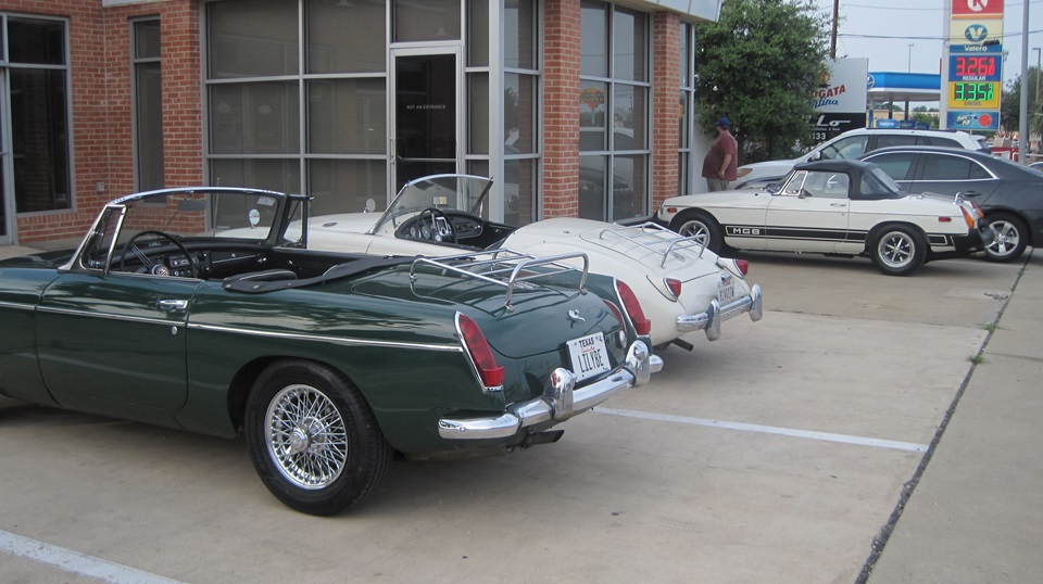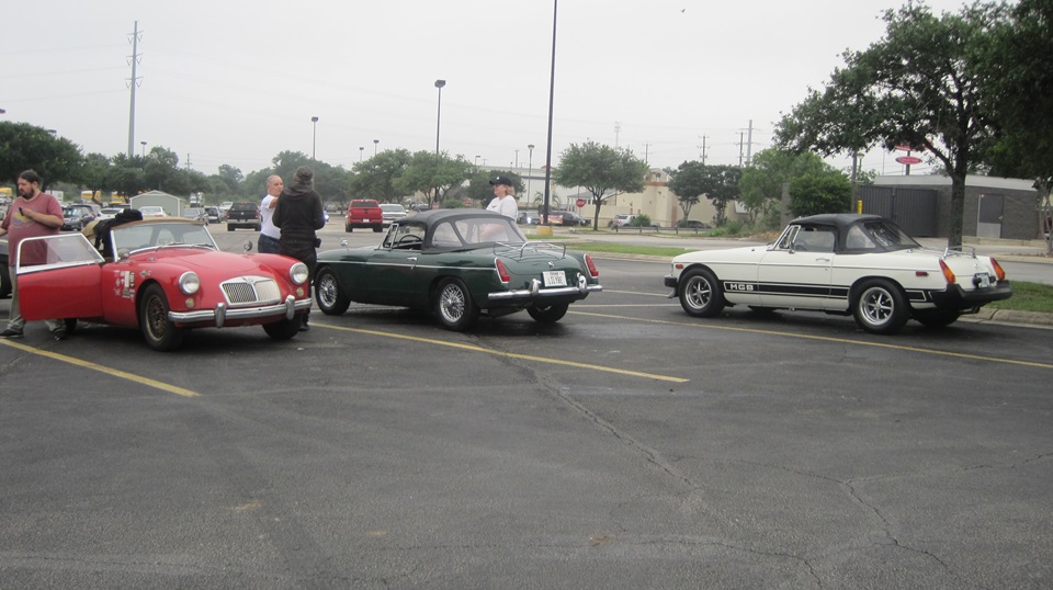 With the black bonnet properly installed, we took the opportunity do do an oil and filter change in our car (just every 4000 miles or so). And another local club friend (himself not so local) Jon Etheredge from Red Rock, TX stopped by to chat. He has an MGA project car that had sat for something like 30 years with the cylinder head off. Also worn out engine, but someone else had donated an MGB 1800 3-main engine for the cause. This sounds like an MGA we will need to visit soon. -- After 4-pm, time to break up the party and toddle off to find a WiFi spot for late lunch/dinner and time to process these photos and notes for your enjoyment.
