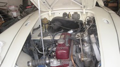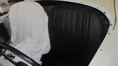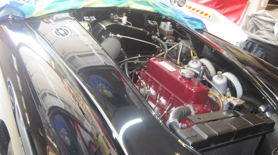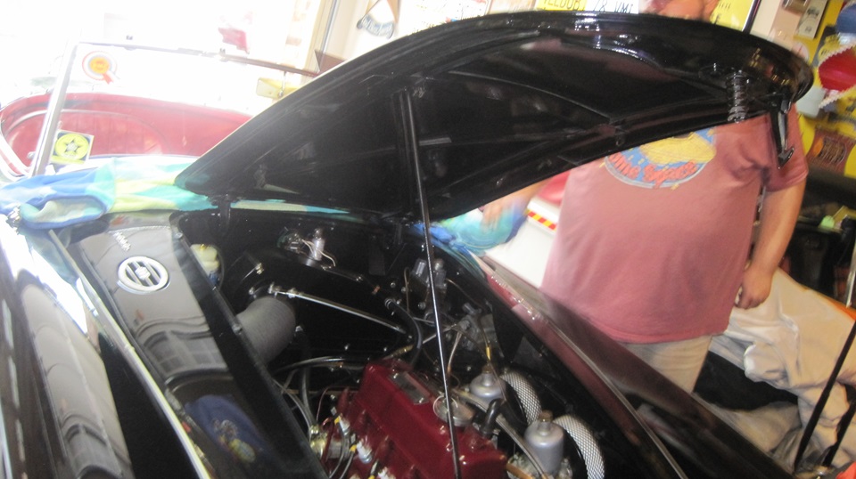 Mid day today we dropped in to visit James Conrad in Helotes, Texas, a northwest suburb of San Antonio. He has this nice MGA 1600 with red interior. fully restored concours show quality car. I have seen this one before, in eastern Pennsylvania in 2008. I mentioned at the time that this is one of the few black and red MGA I have ever seen with the correct color red for the interior. This knock your eyes out bright cherry red is indeed the original factory red interior color. Not long ago this car suffered a self-inflicted wound, ending up with a scratch across the painted bonnet. So James had the bonnet off to a shop to have it repainted. Today we would help to reassemble it, hopefully without scratching it again.