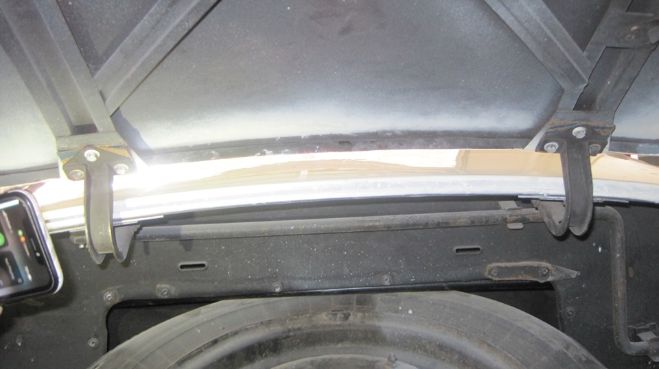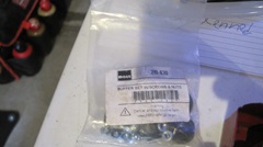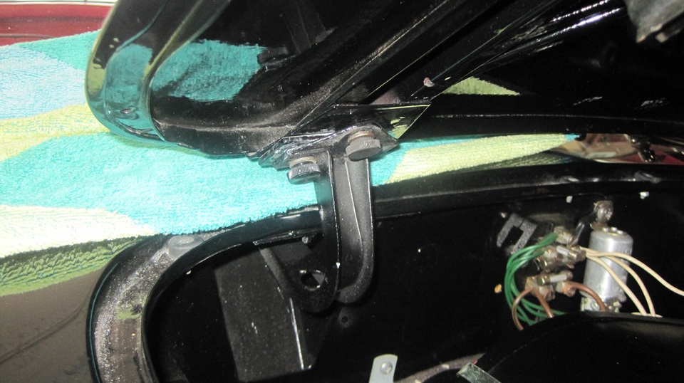 Then the freshly painted bonnet was not sitting entirely flush on the black car. This was due to recent issue rubber buffers from Moss Motors being too short. A pro shop doing work on the car had shaved some rubber buffers in half crosswise to double stack buffers as the rear edge, but that left the bonnet sitting a bit too high in the rear. Easy solution, if you know what it's all about. the Magic Trailer anted up a new set of bonnet buffers with the required fasteners. Doctor's bag from the boot also offered a dozen #10 flat washers. The trick here is to install exactly one flat washer under each rubber buffer to bring them up tto the right height to let the bonnet sit flush.