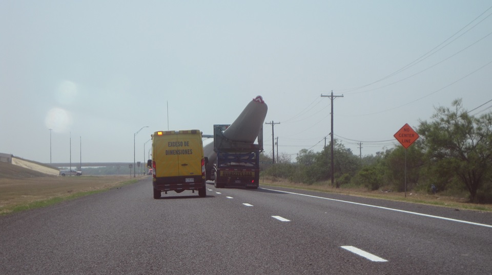 Approaching Brownsville, TX, we were following a few new windmill turbine blades. Not unusual these days, and they commonly travel in sets of three for one windmill. But then they stopped and blocked the road for a while, and it was 102dF in full sun, not fun, so we hauled into a truck stop for a short cooler.