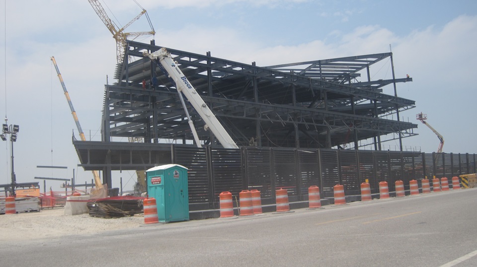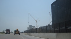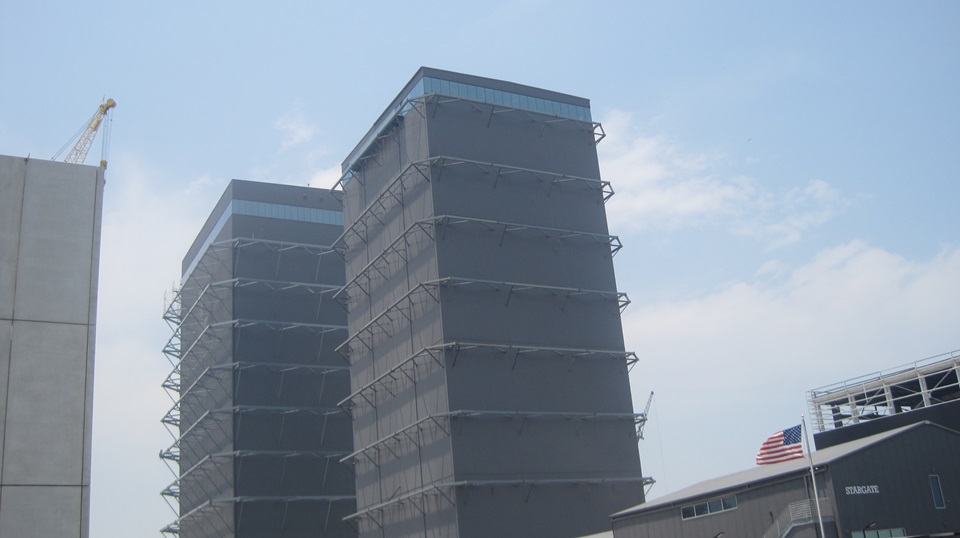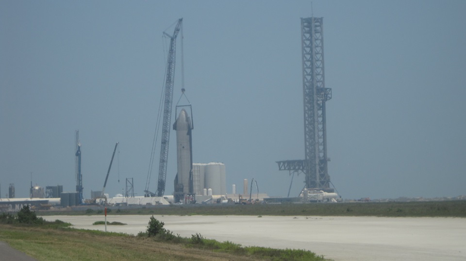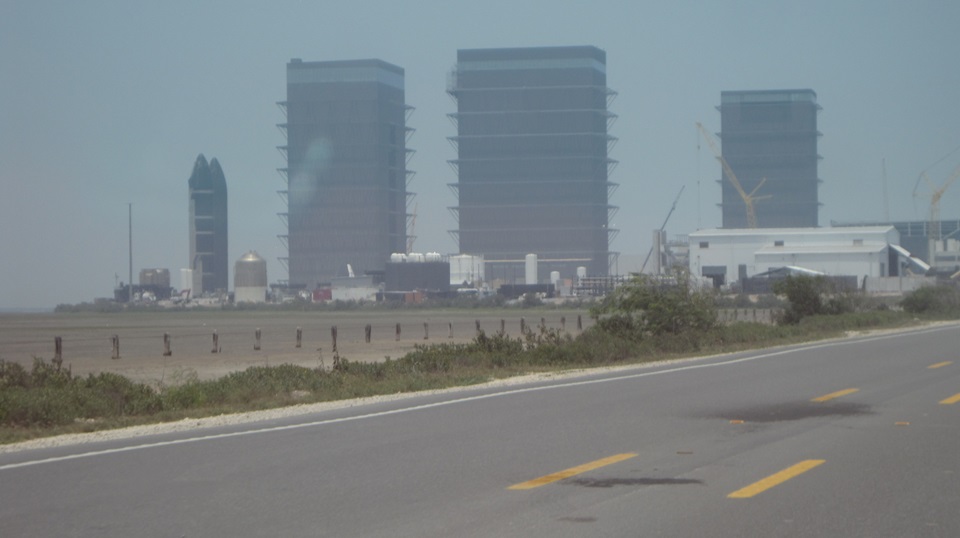 More construction as they are building out the rocket factory. Amazing that Rt-4 highway goes right past the whole complex, just pull over and take pictures. A long row of residence buildings for workers living on site. - - Then our first view of the launch tower with a "ship" on the crane nearby, and a view of the "old" tank farm in between. There used to be eight vertical tanks, at least two of them since removed, the rest may be going away soon. The launch complex now on the right side of the road.
