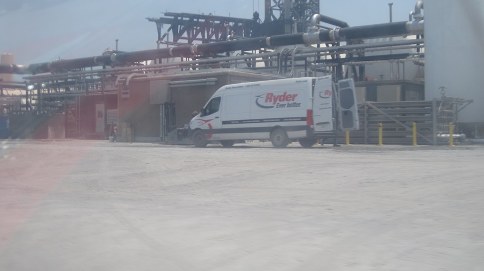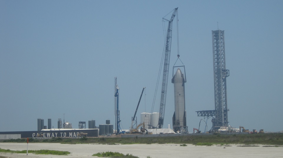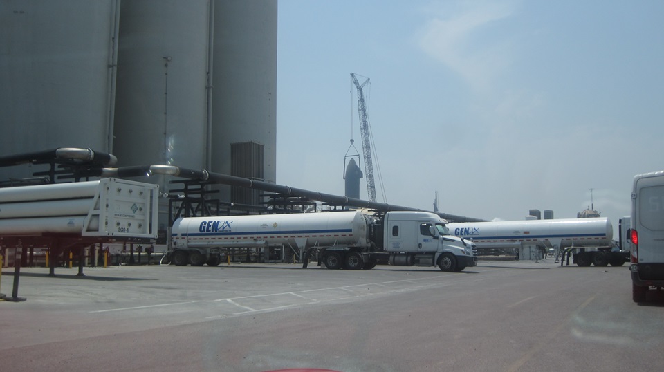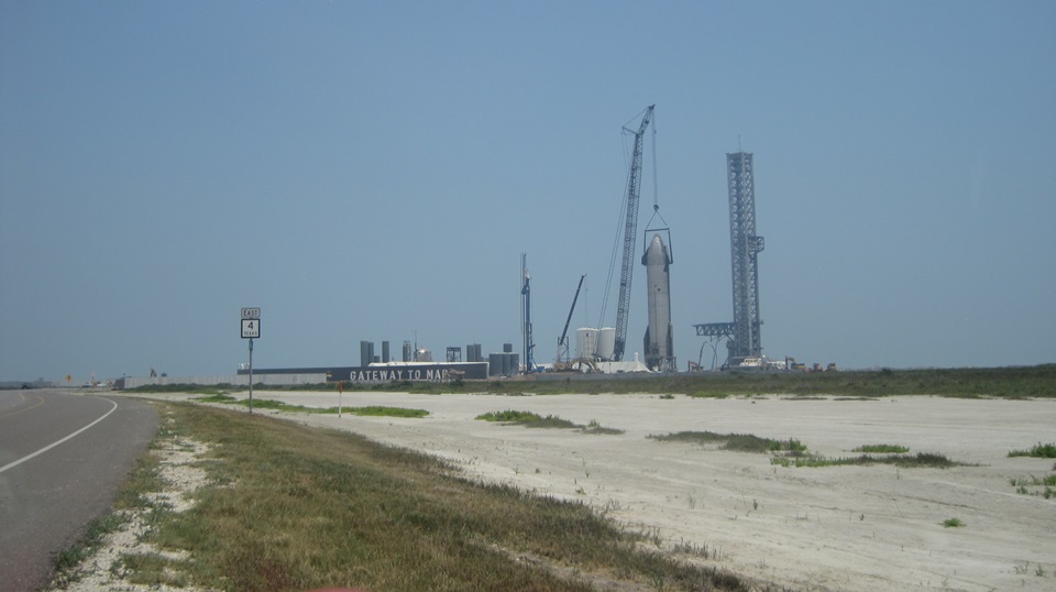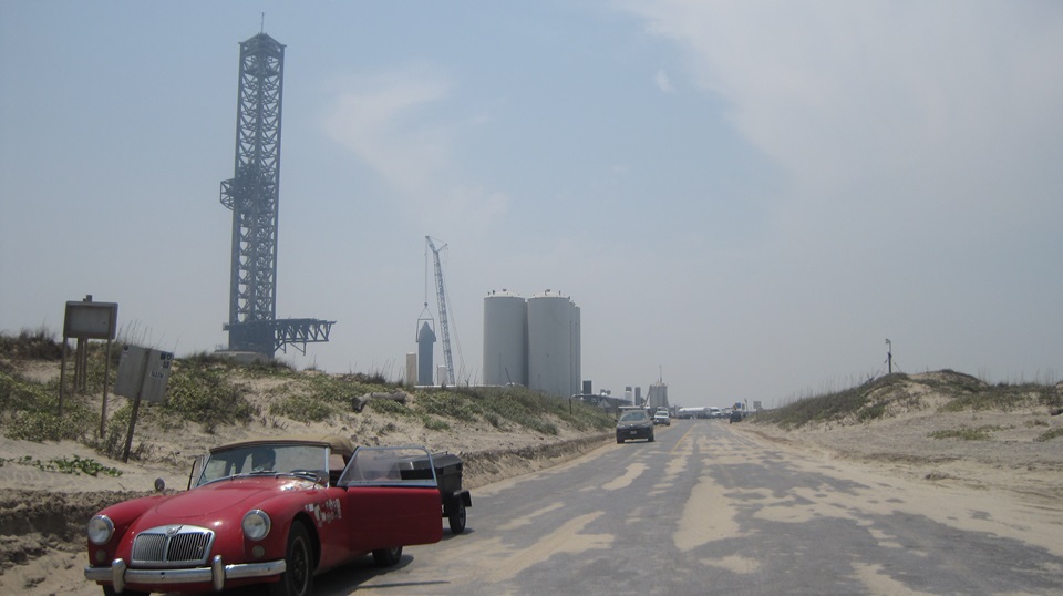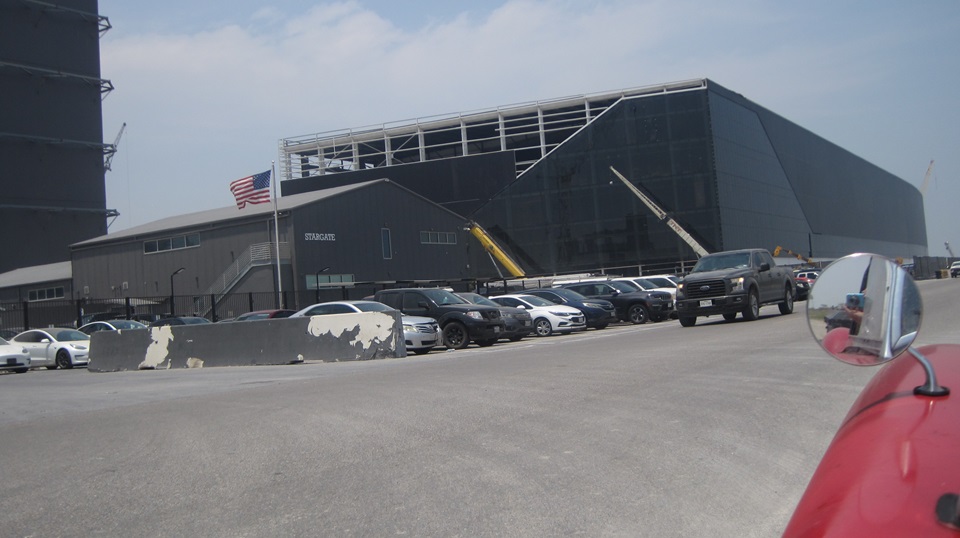 Time for a U-turn to head back. The horizontal arms at the base of the launch tower are the "chopsticks" they use to lift the booster rocket onto the launch mount, and to lift and stack the "ship" on top of the booster. If all goes to plan, the chopsticks will also be used to catch the returning rockets out of the air when landing, and put them back on the launch mounts or transporters. We were delayed a few minutes waiting for a couple of GenOx trucks to back in for unloading liquid oxygen. On the way out, lots of trucks and other industrial vehicles moving about, so we definitely felt out of place. I've been to Cape Canaveral, Florida before, and you certainly don't get this close to the action there.