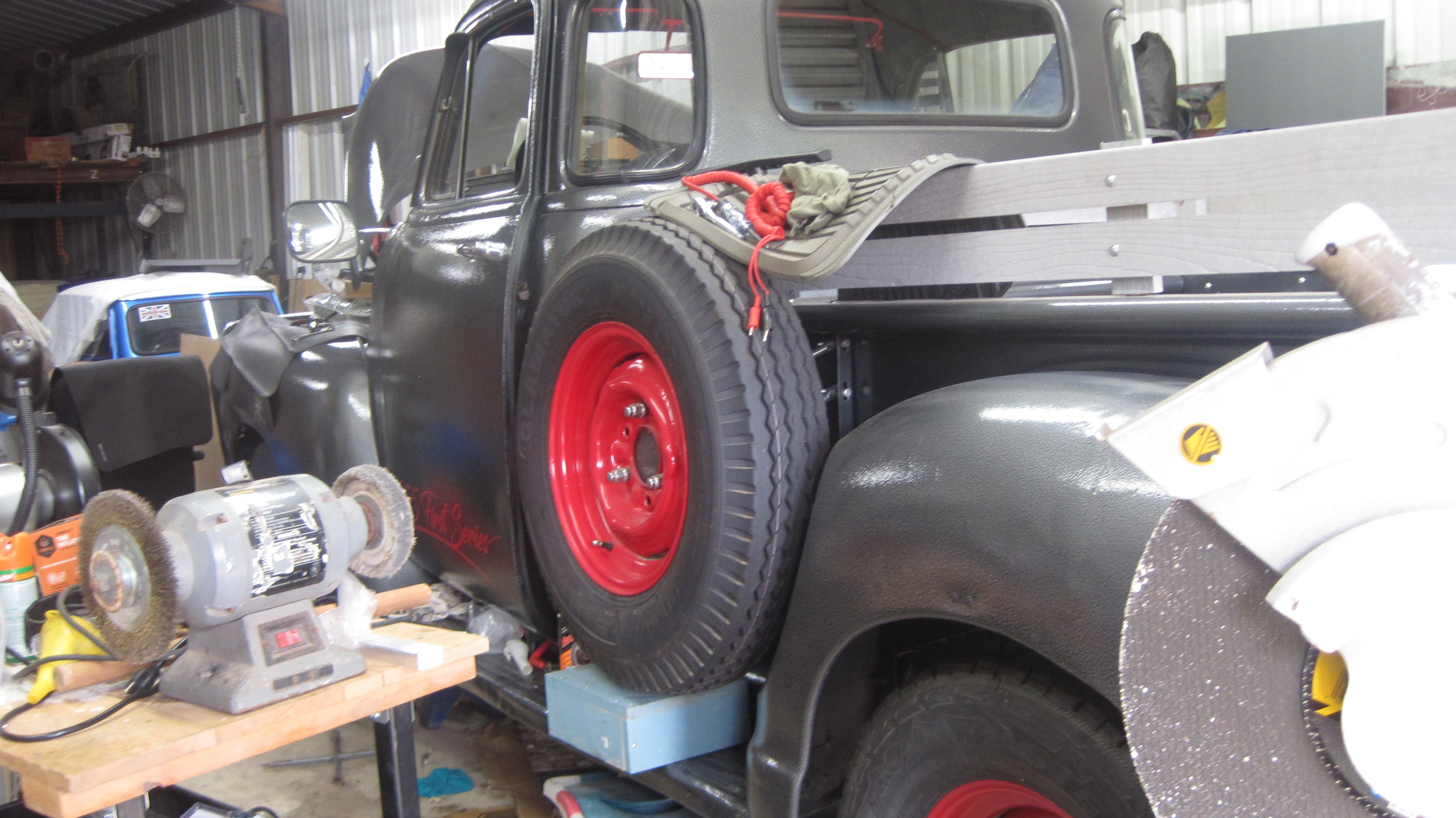 One that didn't change was the small utility trailer that we helped him procure and retrieve from a neighbor in 2015. It begs to be sandblasted and repainted, and maybe new tires. There is a newer MGB in pretty good condition, procured for a good engine and overdrive gearbox and the hardtop. The neater toy now is his 1953 Chevy 3100 truck. Just a bit rough but progressing with restoration. He recently swapped in the lager optional engine.