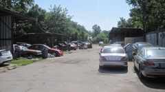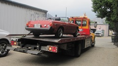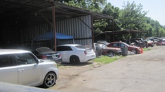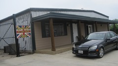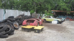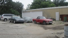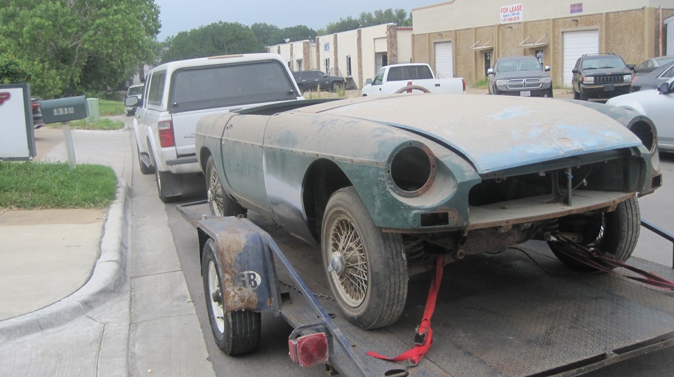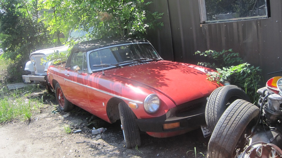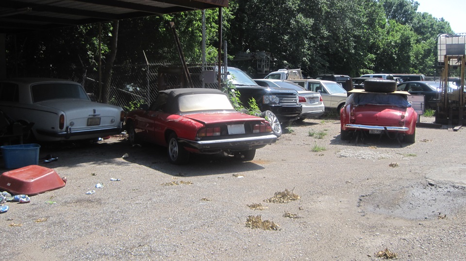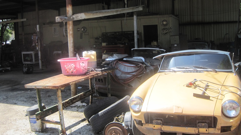 Another MGB arrived on a flat bed. after this one was rolled off the truck, it started and ran okay, and was driven into the shop. No idea why it needed a tow. Busy place. Seems like they are getting a few cars daily for service. A look out behind reveals plenty more projects to keep them busy.