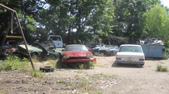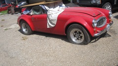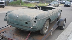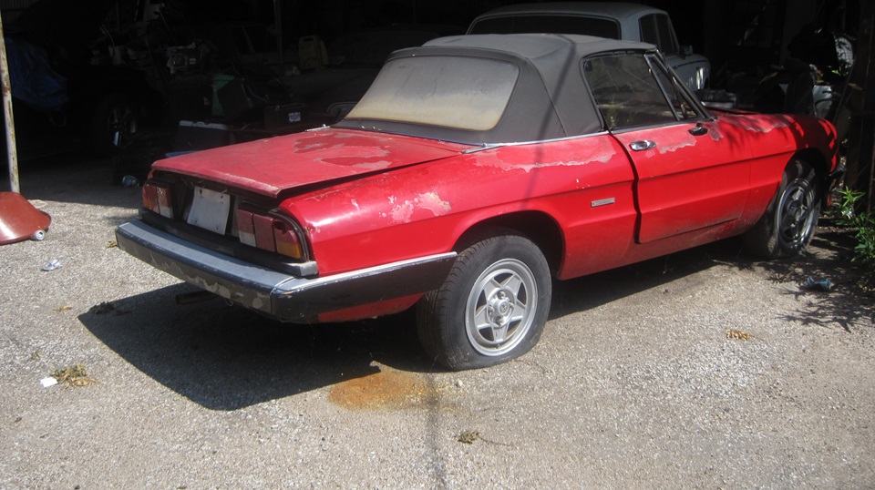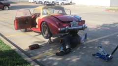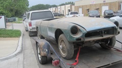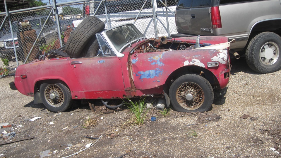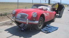 Got the car unloaded at Sportscar Warehouse and paid the towing bill. No space in the shop, but plenty space outside. We pushed the car onto a nice cement apron in front of a garage door, jacked it up to set the rear axle on a pair of jack stands, and proceeded to drain the differential oil. Remove two wheels, two brake drums, and two halfshafts (one broken). By great fortune they happen to have one very rusty MGA 1500 steel wheel parts car in the yard, nearly folding in half in the middle. Remember this picture