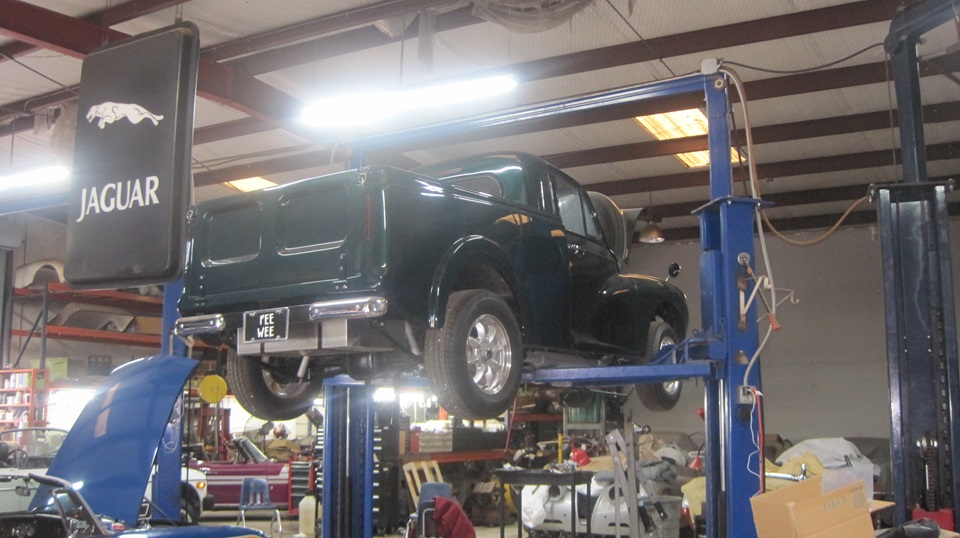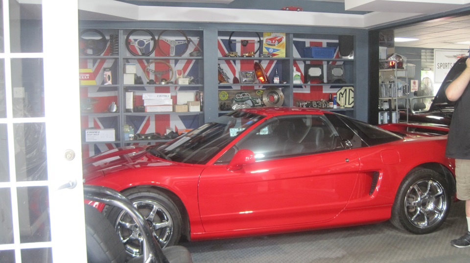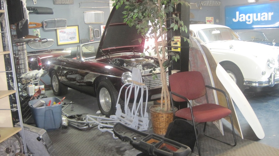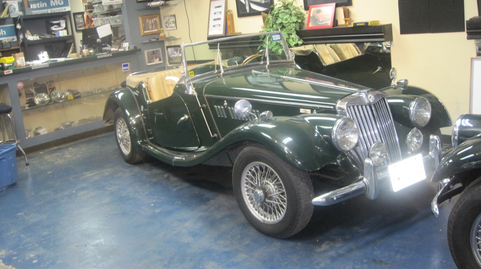 Head up front for a peek in the show room. Lots of toys here. Maybe not everyone needs a Ferrari, but there was a vintage Jaguar sedan, an MGA, an MGB V8 conversion, an MG TD, an MG TF style kit car with fiberglass body and MGB engine and chassis parts underneath.