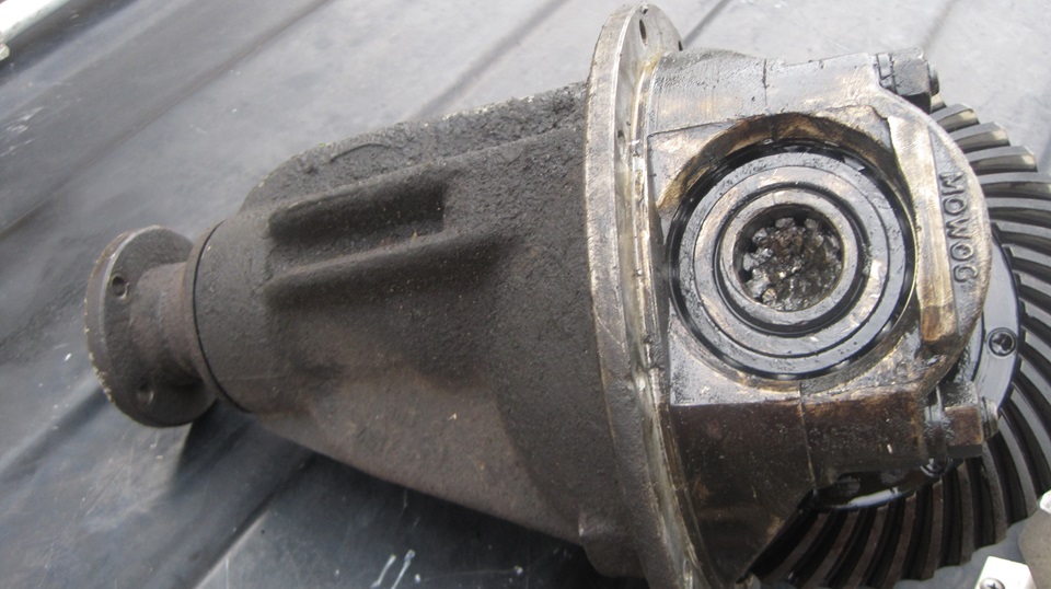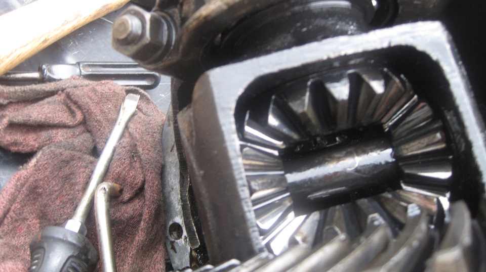 Not long then to reinstall the planet gears with spherical thrust washers and pinion shaft and locking pin. Finally use a center punch to peen two spots either side of the hole to swedge the casting metal inward a bit to secure the locking pin. Then get the ring gear and differential assembly with bearings back into the carrier with the nuts tight on the bearing caps.