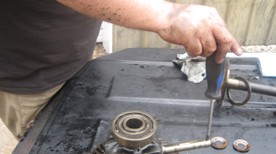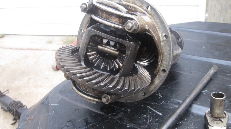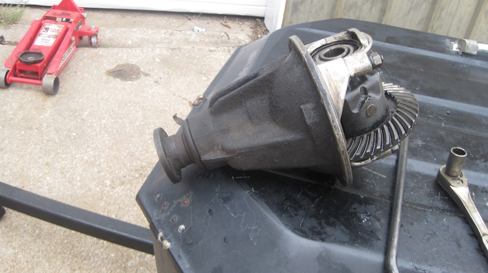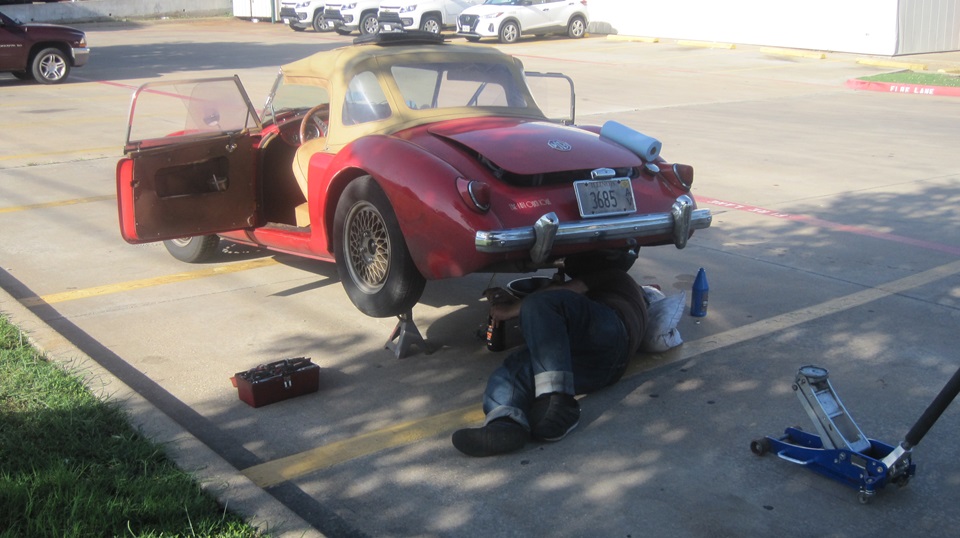 from two days earlier? We finally managed to get a jack under the differential and got that onto two jack stands. Not long to remove wheels and brake drums, and pull the halfshafts out of that one. By that time the mid afternoon Texas sun nearly had us frazzled, but we persist. I crawled under the back end of our MGA to disconnect the propshaft and block it up out of the way. The combination of lying in the shade and a slight breeze helped recovering from heat stroke, so the work could continue. Remove another 10 nuts, and give the the diff a whack or two to break it loose and pull it out.
