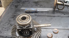Back under the car for the drudgery part of he job. Seemed like nearly an hour scraping remains of the paper gasket off of the front face of the axle housing in between ten threaded studs. mopping up and washing out inside he banjo housing. Finally install a new paper gasket, push the differential assembly back into the housing, install he ten nuts with lock washers, four more bolts to reattach the propshaft, apply Teflon tape to two pipe plugs, install the drain plug tight and the fill plug finger loose (to be filled later).