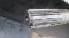 Then we had time for inspection and pictures of the halfshaft splines. The first two pictures are the replacement halfshafts that came from the parts car. Amazingly these look like factory new with no visible wear at a ll on the drive splines. We install these left and right side respectfully same as they were in the parts car, so they will drive in the same direction as original. The third picture is the unbroken halfshaft just removed from our car, showing lots of wear on the splines, deep enough to set my finger nail into the depressions. That was the moment we decided not to keep that one as a spare part.