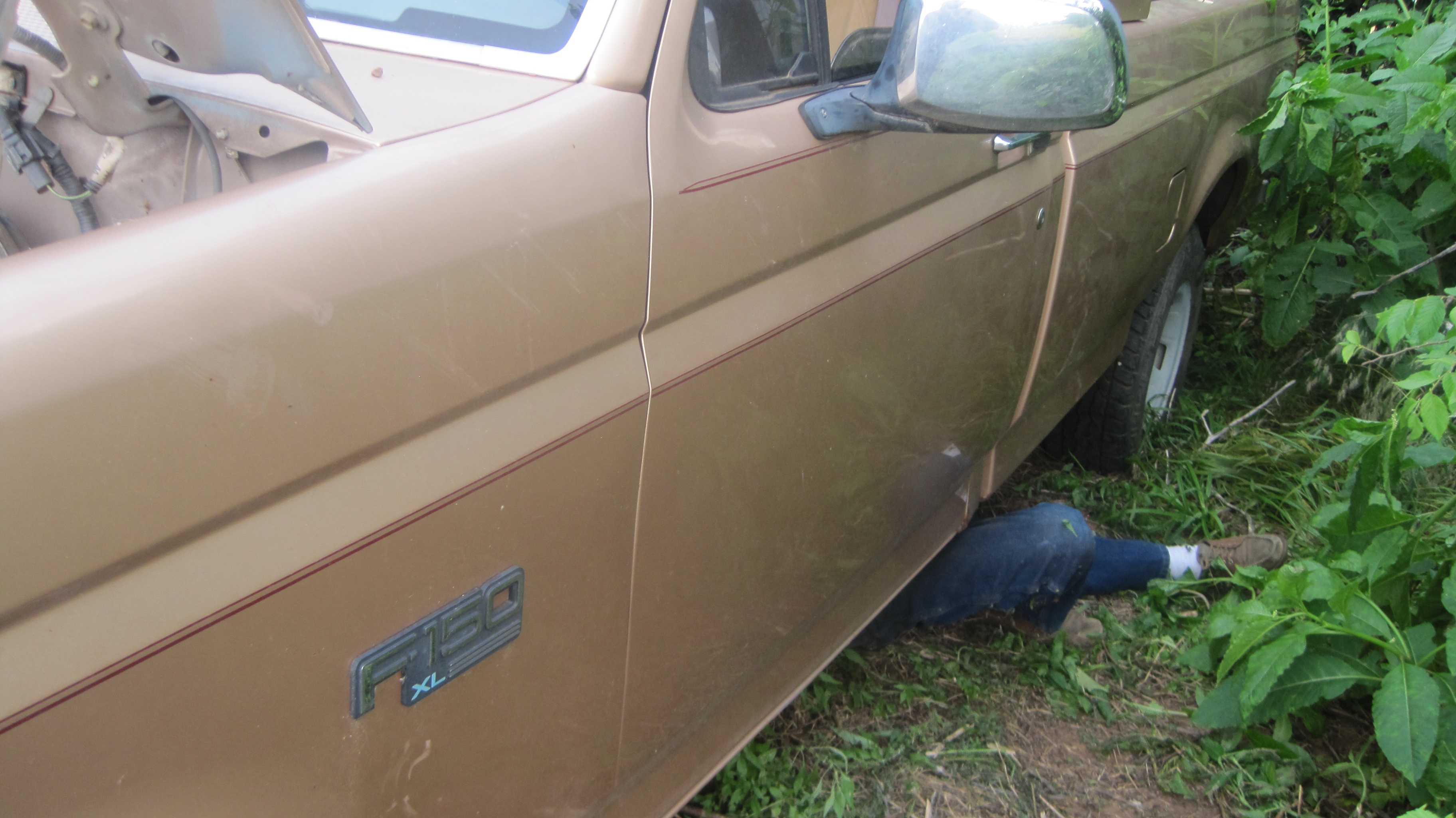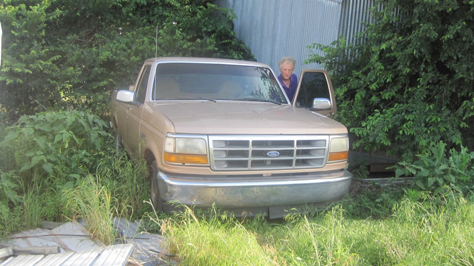 Rained pretty good over night, still raining in the morning, so we slept in until 9-am. Then headed north a couple hours, arriving Shawnee, Oklahoma in time for late breakfast. We were immediately met by Ron Cleveland from Prague, OK. This is the guy who was rescuing an ex-race car MGA project car from St Louis, MO area in early September 2022, when we spent a few days helping get it moved off-site. That one is currently in process of restoration in Prague, OK, , and we may get a few photos later. But today we are on a different mission. Ron recently bought an old Ford F150 truck with engine running two years ago, but not since. It is a 250-cid 6-cyl with 5-speed gearbox, but was missing the 2-piece 3-U-Joint propshaft assembly. Now he has a new propshaft, and we will have a look to see if we might be able to get it running. So grab the propshaft, a couple gallons of fresh fuel, a good battery, a ground mat and a tow strap, An hour and a half later, 80 miles to the west, we get first look at the truck in the grass in Tuttle, OK.