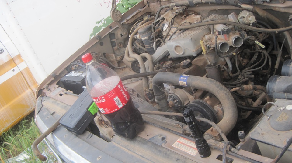 Since it did run previously, the object today would be to drain whatever might be left of 2-year old stale fuel,but alas, no drain plug in the tank. Then flush the lines all the way up to the engine, and pump through some fresh fuel. While we had a battery and some jumper wires to run the fuel pump, we were stuck when we did not have the special tool required to separate the quick connect fuel line couplings. So in the end this would require a trip to a parts store for the (cheap) tool, and quickly running out of daylight, it would have to wait for another day. Bummer. We did take the friendly rooster back to the coupe before we left.