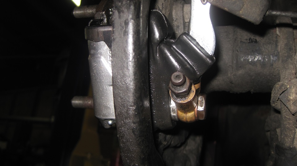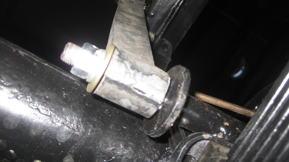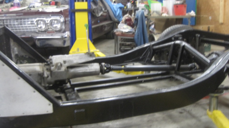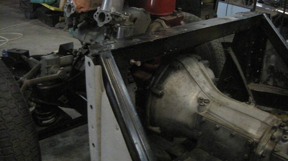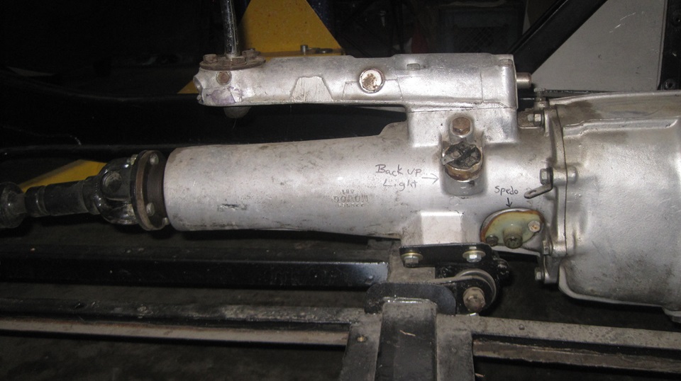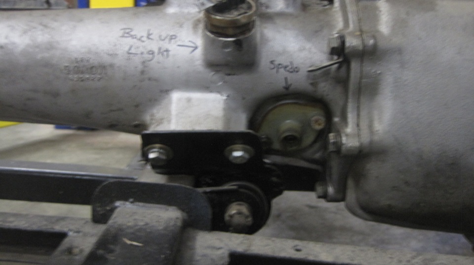 The larger MGB gearbox is tight in the MGA frame.Interesting rear mount has a top cradle plate for the MGB rubber blocks, and a lower clevis bracket with MGA Silentbloc rubber bushing and cross bolt.