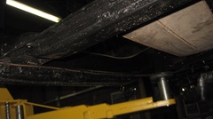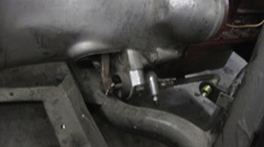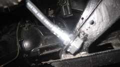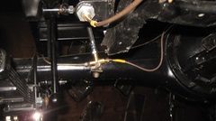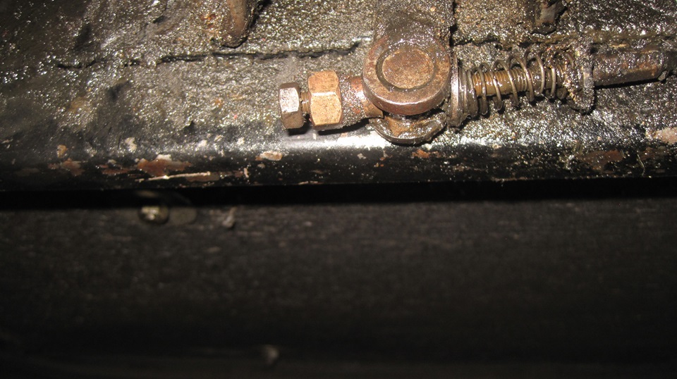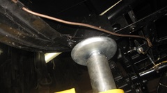We had look at the rear axle rebound straps, another faulty part from Moss that has been known for several years. After three failed attempts to reproduce this part, the straps never have enough tension fiber inside, so they either stretch or break(or both). These straps have never left the garage, but they have stretched from original 8-5/8-in to 10-1/4-in long. Here the shock absorbers hit end of mechanical travel (susceptible to serious internal damage), the parking brake cable is stretched over the exhaust pipe, and the axle housing is close to hitting the exhaust pipe. These straps definitely have to be changed.