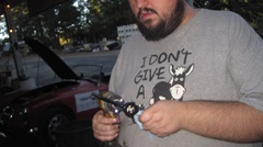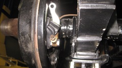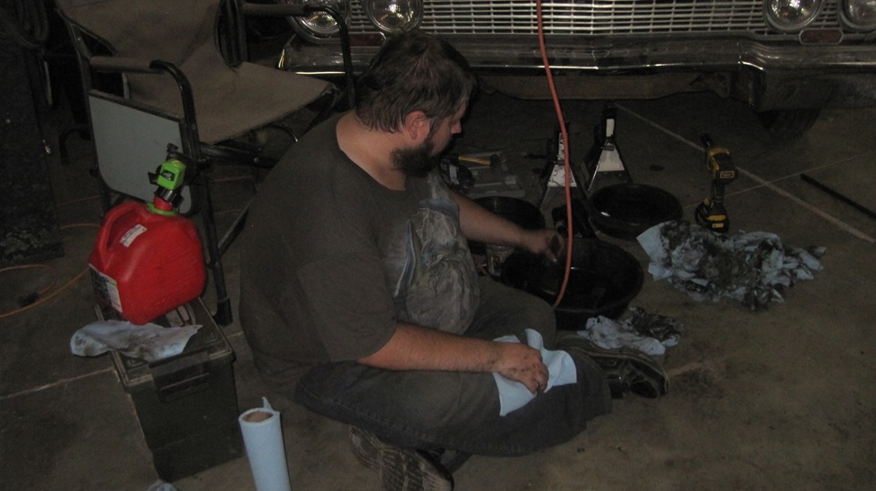 With that bit of experience the right side slave went together much quicker, no leaks on the first pass. Back off the hand brake cable to full loose before assembling the brake shoes and springs and keepers. Be sure the slave cylinders are fully compressed, adjusters backed off, drums fit over the shoes, and then adjust the rear brakes to minimum clearance before adjusting the hand brake cable. Then you can bleed the hydraulics. The last picture is Elliot doing the messy grunt work of cleaning all of the old brake parts with gasoline, then with lacquer thinner to get the dirt gas off. He did the brake drums first so I could take them outside to paint them, allowing some drying time as he was finishing cleaning the smaller parts.