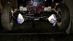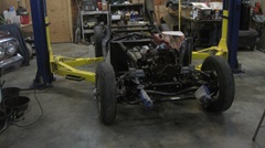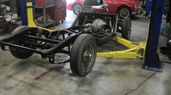Just getting into breakfast and email when Stu showed up with a couple more guys to help move the restomod rolling chassis. So get my MGA and trailer out of the shop temporarily, shuffle a few things around, push the rolling chassis into the shop and get it aligned with the lift. Ten minutes fiddling with jacking points, and up it went. Then Stu had to rush off for business, so we pulled the car and trailer back into the least obtrusive spot in the shop and got back to soggy cereal. The restomod chassis will keep us busy for a while. MGA chassis, MGB 1800 5-main engine with HS4 carburetors, 4-synchro 4-speed gearbox, think 1968-1971 vintage.