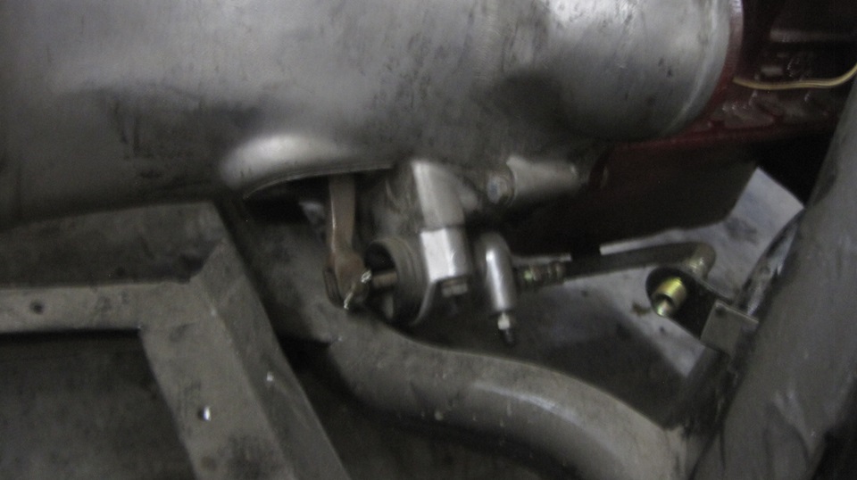 Did I mention it was a miserable chore? We finally got it done, and trimmed the bottom edge of the panel a little to clear the top two bolts on the bellhousing of the 4-synchro gearbox. Another half hour in the evening to get the clutch hydraulic pipe formed to fit snd connected with the banjo fitting up top. The clutch master cylinder pushrod was also installed and adjusted (not shown in the picture yet).