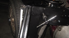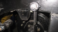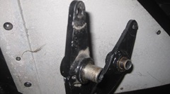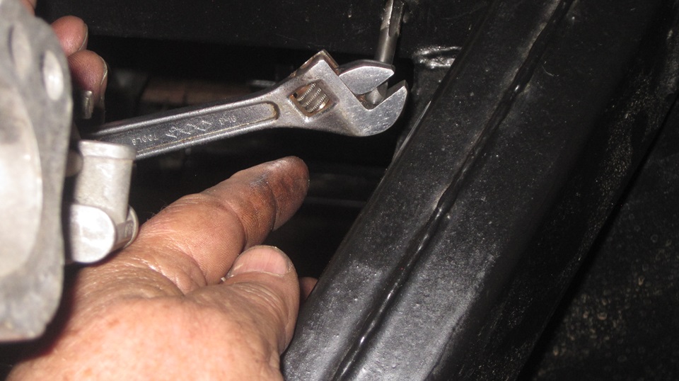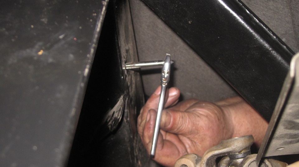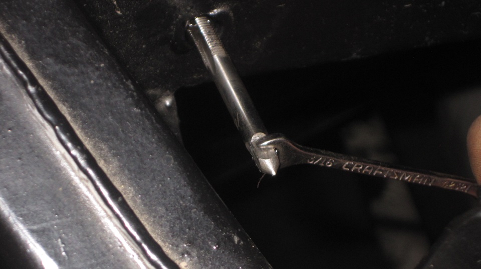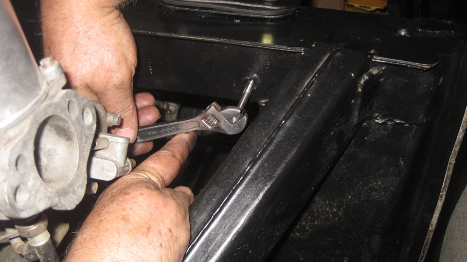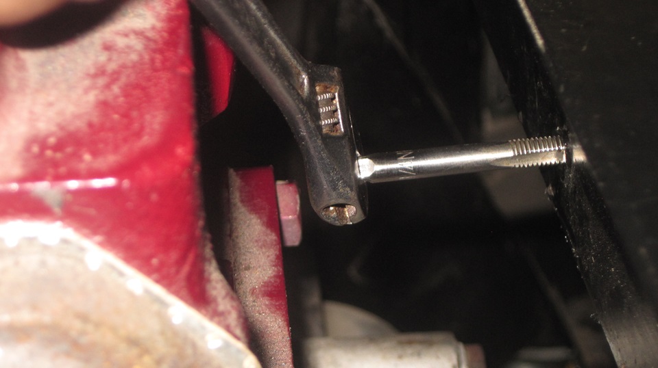 Today we want to install the frame closure plate below the frame goal post behind the engine. Nine 1/4-28 bolts required, and again, unfortunately, the threads had not been tapped out after frame painting. Three holes each side severely obstructed by the frame angle tubes, and one hole directly behind th engine. So kill half the day turning a small thread tap with a small wrench.