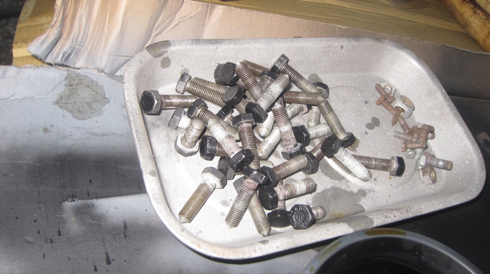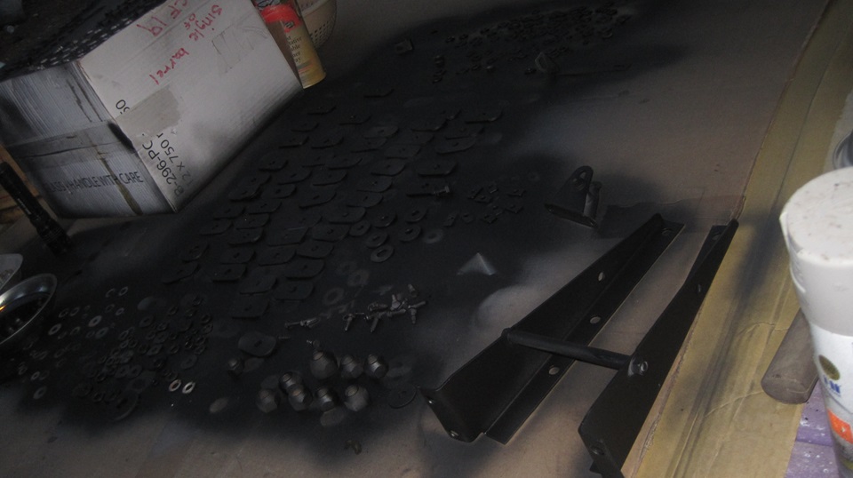 The next collection was a basket full of nuts and bolts, mostly pointed body bolts and oval fender washers,which Stu ran through the sandblaster for clean up. Not building a show car, just a good driver car, so the fasteners will not be zinc plated. Poke holes in cardboard, stick the bolts in, and paint the bolt heads. Lay all the washers on cardboard, paint one side, let dry, turn over, and paint the other side, spray at an angle to paint ID and OD of the washers at the same time. For small brackets, lay down, paint, turn over, paint again.