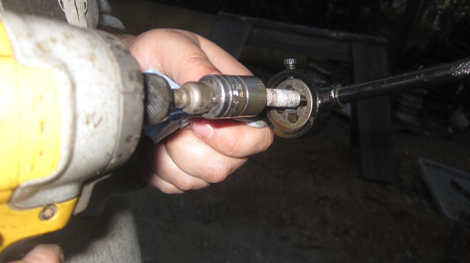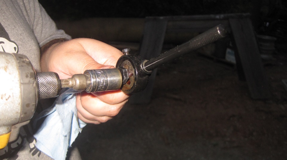 The bolt threads had not been cleaned after sand blasting, so do that next. Grab a 5/16-24-UNF threading die mounted in in