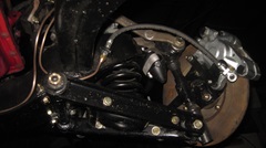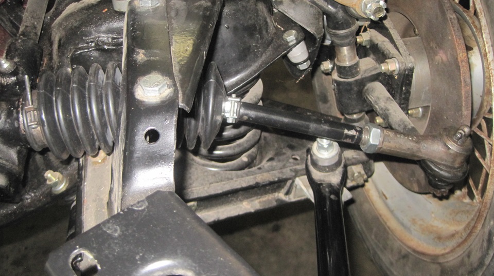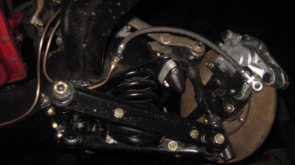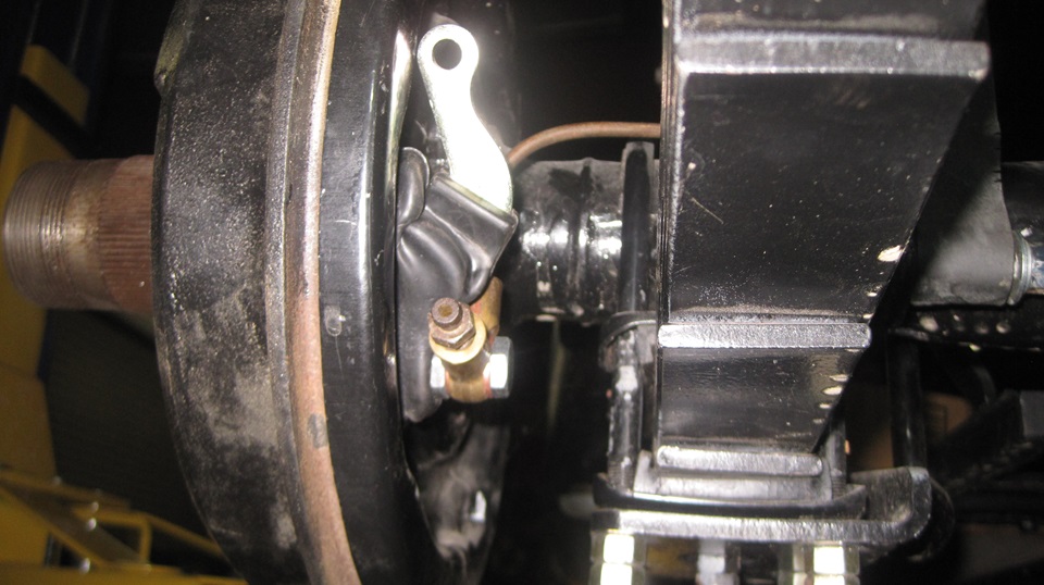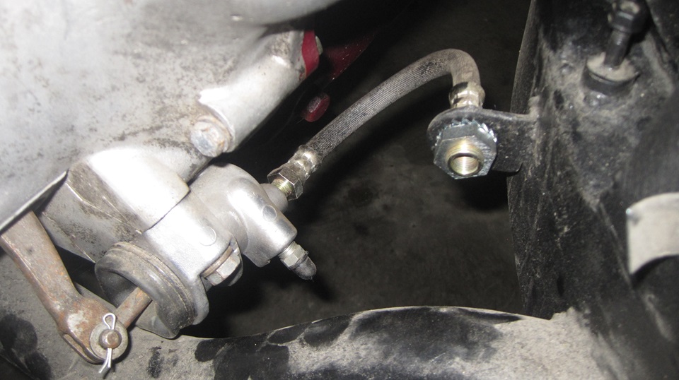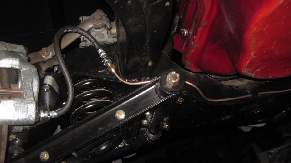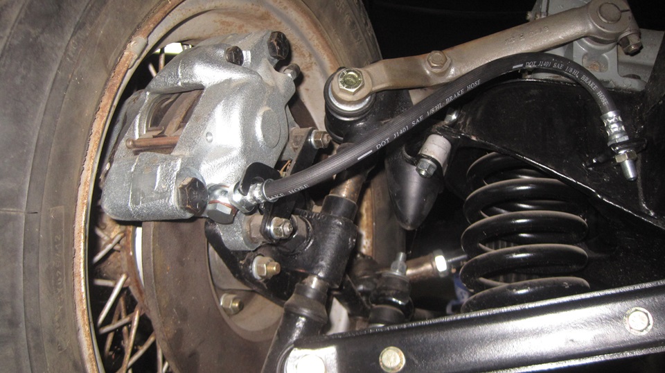 Pushing toward installing brake control parts on the rolling chassis, we spent much of the day pulling some parts out of the Magic Trailer, checking and updating inventory, and making a list of parts still missing that may need to be ordered. We recently took delivery of a pair of rubber boots for the rear brake slave cylinder lever dust excluders. Those came right back out of inventory to be installed. We also found one front disc brake hose, one font banjo bolt, one rear banjo bolt, and some copper sealing washers, so on with the show. Left front hose installed, right front still waiting for its hose and banjo bolt.