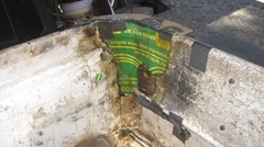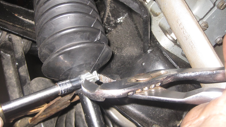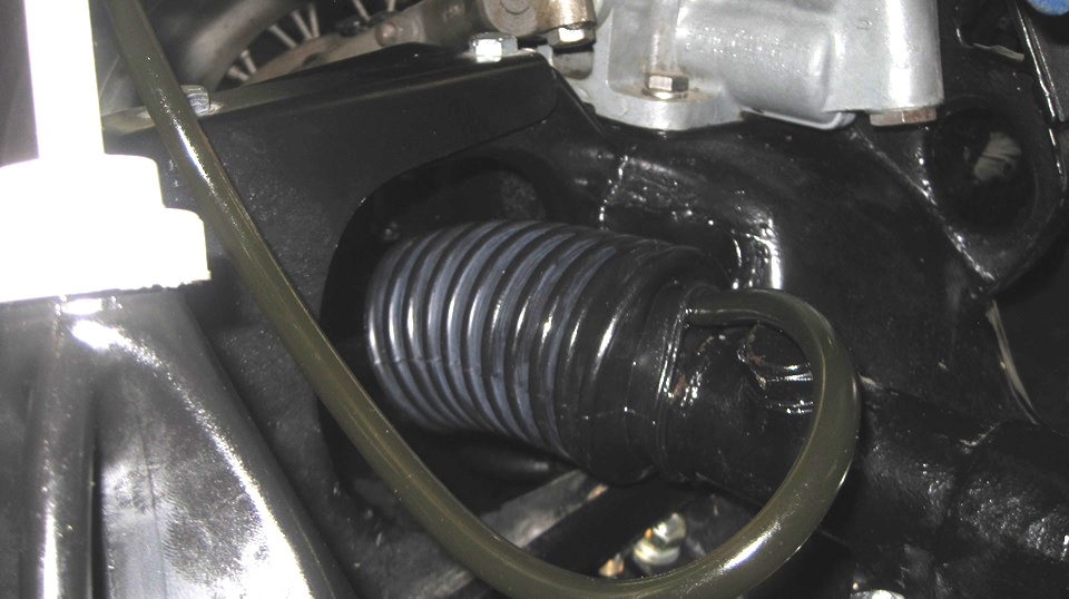 With the rubber boots installed, we need to fill the steering rack with 6 to 8 ounces of EP80W90 gear oil. The proper and easiest way is to inject it through the angled Zerk fitting on top of the rack housing using a "palm gun", just a small grease gun with oil in it instead of grease. Sorry, I don't carry the palm gun in the trailer. But I am used to injecting the oil into the rubber boot using a manual pump on top of an oil bottle, same tool I use to put oil in the differential (or a side fill gearbox). I commonly inject oil into the small end of the boot using a trigger pump oil can, but I don't want to remove that miserable clamp to do it. The rolling chassis has clear access to top of the big end of the boot, so we will do it there (see first picture below).