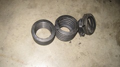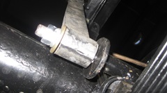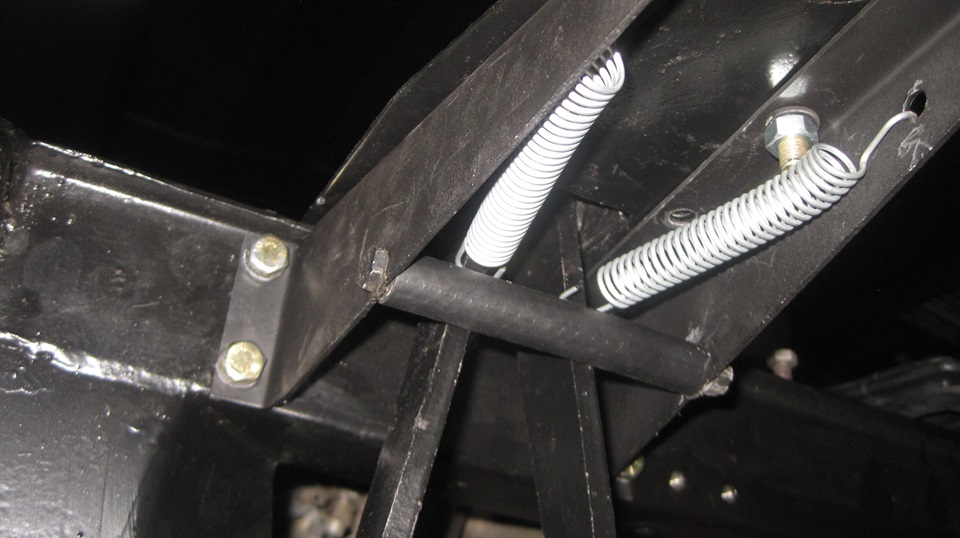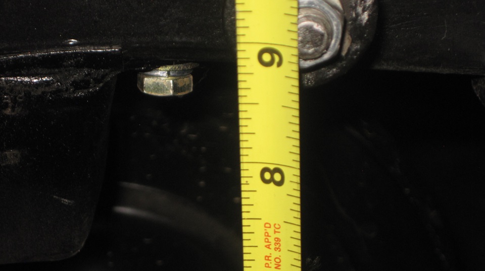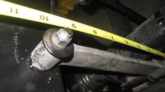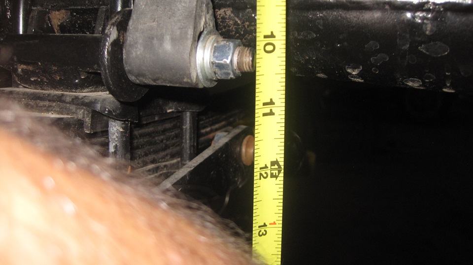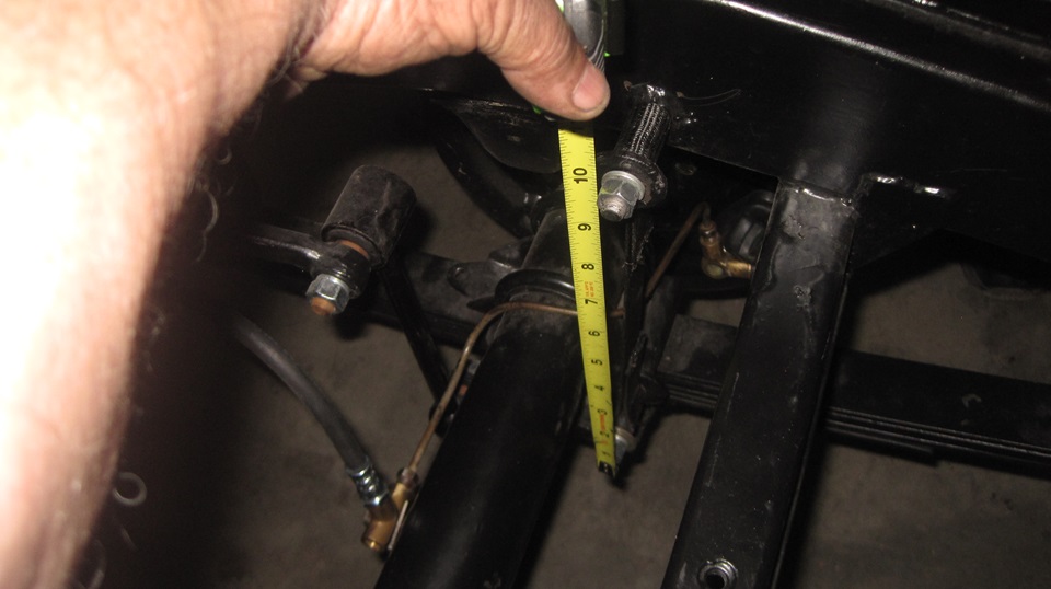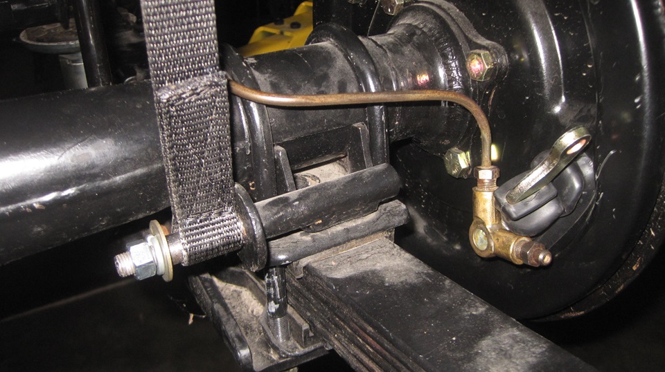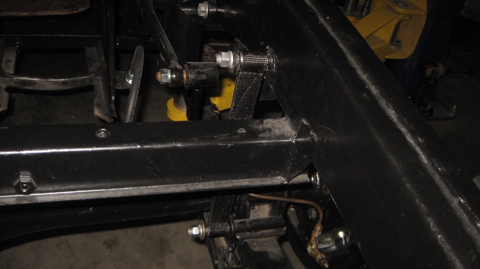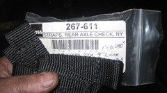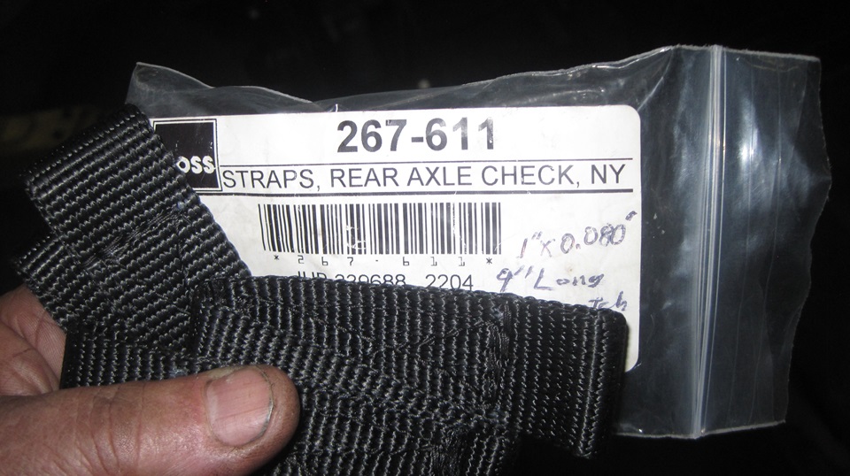 Looking again at the stretchy rubber check straps on the rear axle, stretched to 10-1/4". Put floor jack under the axle and lift until the frame lifts off the hoist. Sit two guys on rear of the frame to relieve tension on the check straps, and they retract to 9" with no load. Worthless rubber bands. Then we installed the thin nylon check straps. They settled at 9" long with the initial axle load. We will leave those loaded for 24 hours to see if they astretch more.