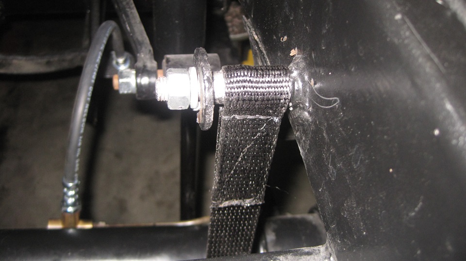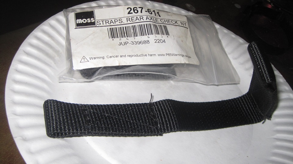 Remember those stretchy rebouind straps from Moss? Unfortunately their current next best option is a pair of nylon web straps that are also likely to be nonfunctional. There used to be an aftermarket nylon strap supplied by "Strapping Lad" on eBay that was correct dimensions , a few wraps, and sufficiently strong to do the job. The current Moss part is one layer of nylon web, only 3/4-in wide and 0.086-in thick (1/16-sq-in cross section). it is also nearly an inch too long in free state. We will attempt to install these straps, just to see what might happen when they are loaded. stay tuned.