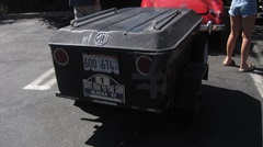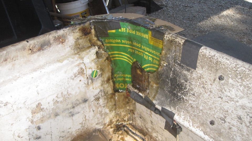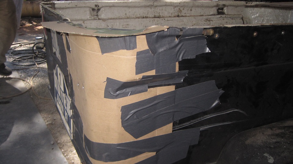 Early start, empty the trailer, remove a bunch of #10 screws from the piano hinge to remove the cover. Remove lots of broken fiberglass from the right rear corner, remove the tail light, tape back some electrical wiring. Cut to fit and tape up some cardboard around the outside to hold the form for the right rear corner, mirror image of the left rear corner. You might notice in the first picture below a piece of 5/16-inch fuel line pipe formed around the corner just below the top flange. That was bent around the LR corner for pattern, then flipped over to serve as a mirror image guide for shape of the RR corner. Being taped in place, it also provides a level surface reference for the top flange that also needs to be re-created. -- Cut some 1-1/2-inch wide strips of fiberglass cloth, mix up some resin, and paint in the first layer of fiberglass to cover and fill all of the open edges inside.That was setting up nicely by sundown. Will do more layers in the morning.