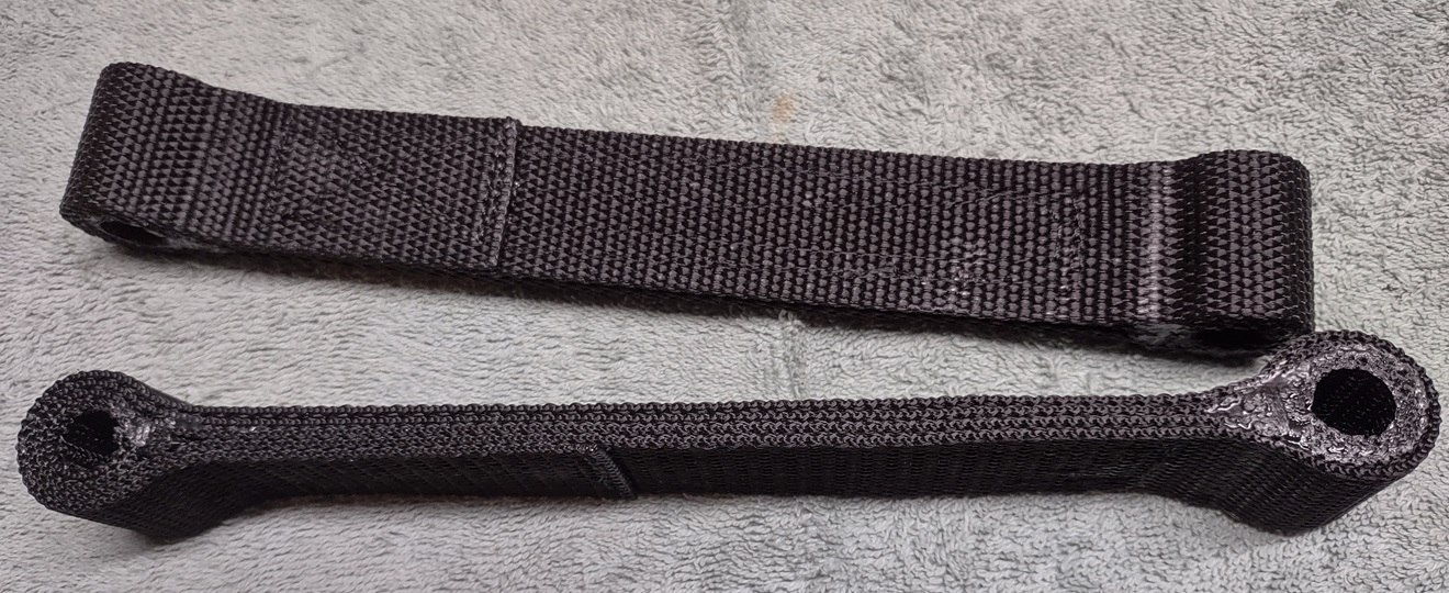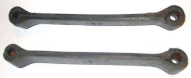 straps on our car. Picture at left is what they looked like when installed July 26, 2016. They were made with 1/2" truck air brake hose in the ends, 8-5/8" center to center, 8-3/4" as installed with initial settling stretch. Now 8-yr 2-mo and 197,500 miles on they are 9-1/4" pin to pin, so only 1/2" extension in 8 years.