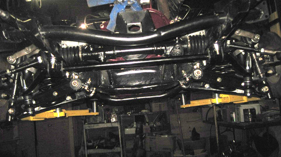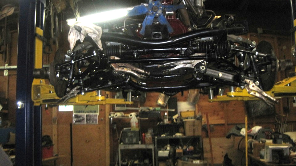 Here is the test fit to the chassis, followed by making three more identical parts, cleaning, priming, painting,drying,and bolting two of them into the chassis. The other two are for the next sway bar installation for Stu's daily driver MGA, which should be happening very soon. We also drilled one hole in the lower A-arm left and right, and installed the last two bolts to attach the lower link bracket. That's it, finished installation with six holes two u-bolts, and two more bolts in the A-arms.