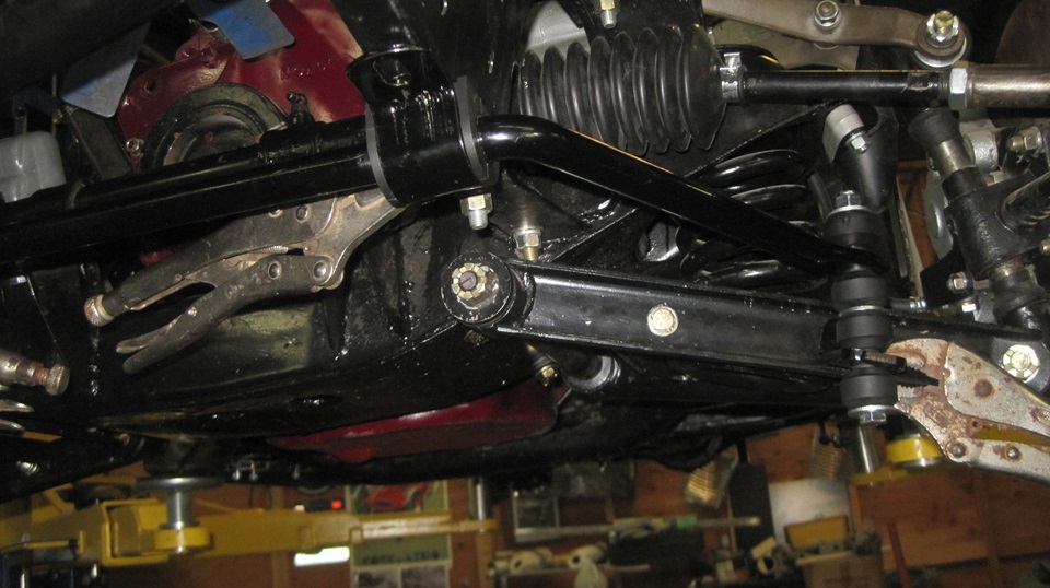 Now that the front face of the suspension looks like all MGA 1500 style parts, the Addco sway bar kit should bolt right on as intended. Start by assembling all of the parts together on the work bench (or on the floor), but off the car. Then offer up the assembly to the car, hold it in place, and position all of the parts in proper alignment. From there is is essentially drill six holes and install the fasteners. This is what I clearly remember doing 37 years ago, in about 30 minutes start to finish. Here we have four Vice-Grip for assistance, two holding the sway bar frame mount bushings, and two holding the end link brackets in the lower A-arms.