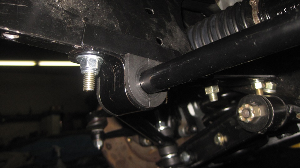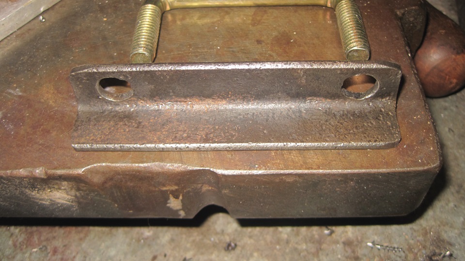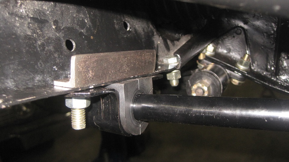 Then I have bit of an issue with the Addco design, with a solution gained by experience with competition driving back in the 90's. Addco uses a square U-bolt to attach the big bushing bracket to the frame, drill two holes and drop it in. The problem is, where the round shank of the U-bolt bears against the frame sheet metal, there is narrow line contact near the hole that makes a nasty stress riser point. After a couple years of vigorous driving, the lower flange of the front frame extension was developing stress cracks under that U-bolt,so the frame needs reinforcing at that point. My suggestion is a piece of 3/4-inch angle iron 4-inches long with two 3/8-inch clearance holes(13/32") drilled 3-inches apart.