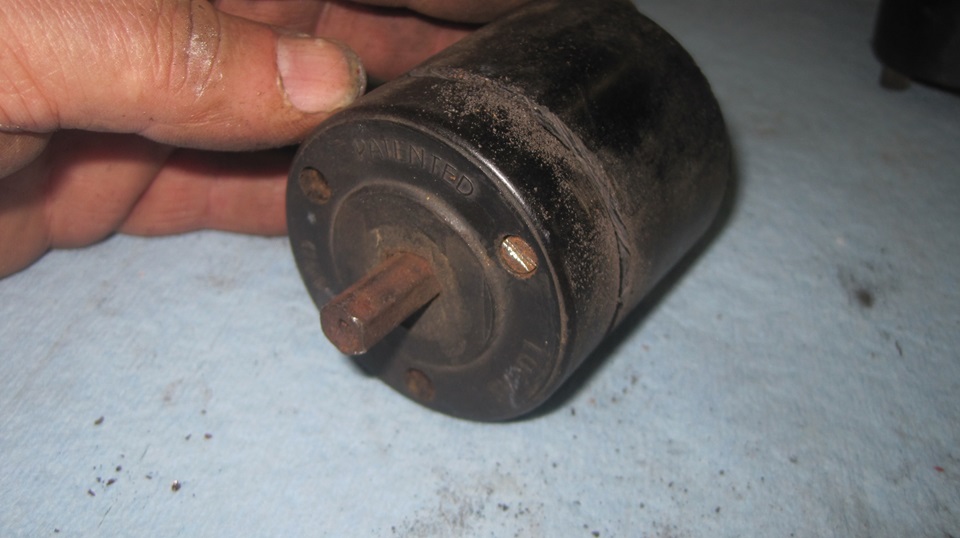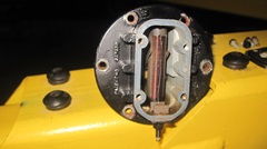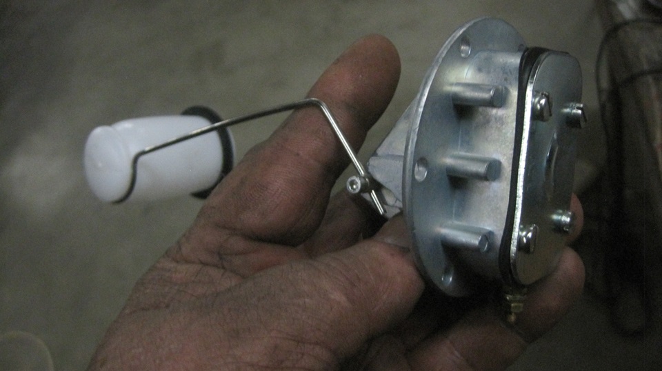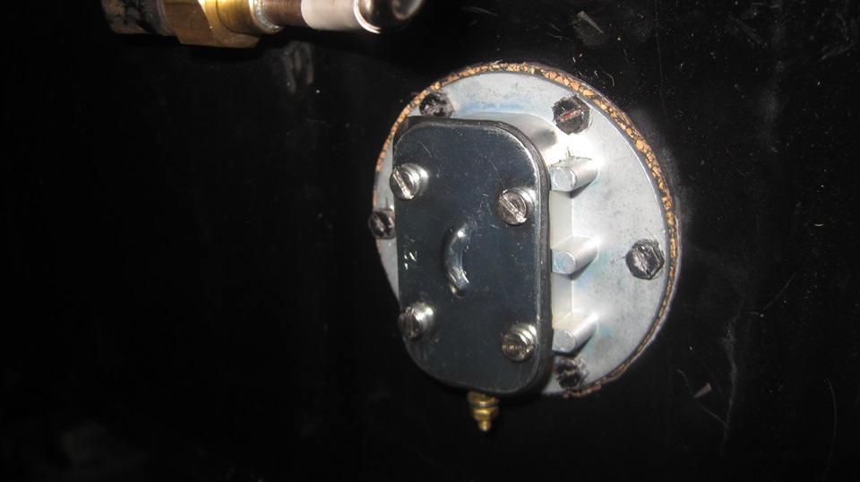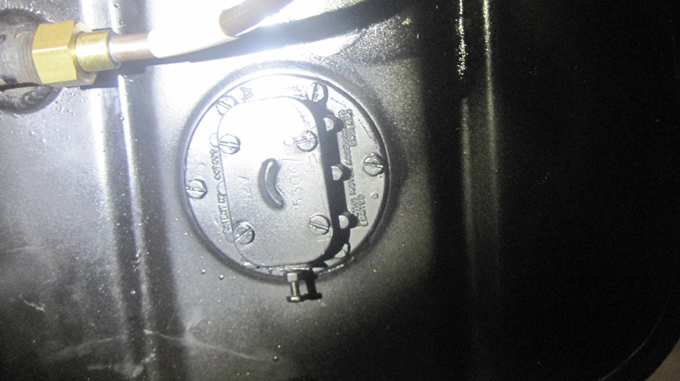 Getting on to late evening, navigator suggested it could be a good time to change the fuel level sending unit in the rolling chassis. I recon Stu had measured open circuit there some time back, and bought a new sender unit. Out of curiosity I wanted to check condition of the old one, and see if it could be saved, maybe. The original screws were rather tight, but they did come out without damage, good to be reused. No gasket. The last person (or two) here had used something like Indian Head Gasket Shellac (that stuff is still around ), and then too much RTV goop, but it would clean up okay. The float arm was tight, would not move by hand, let lone gravity. When I removed the electrical cover I was pleasantly surprised to find it very clean inside. Likely the cover had never been removed. Now encouraged, I soaked the arm pivot with penetration oil, and it moved a little with a good push. So I partly filled the cavity with P-oil, and soon had the arm moving freely. -- the bottom terminal and internal resistance coil and twin wiper arms were a ll testing good electrically, and showing correct resistance, 0 top 80 ohms. Unfortunately there was no ground continuity from the wiper arms to the case. One could solder in a flexible ground wire from the arm or shaft to the case, but that would require R&R of the terminal post and wire wound bobbin for better internal access. Too much fiddly time for now, so we set it aside and opted to install the new sender unit.