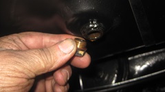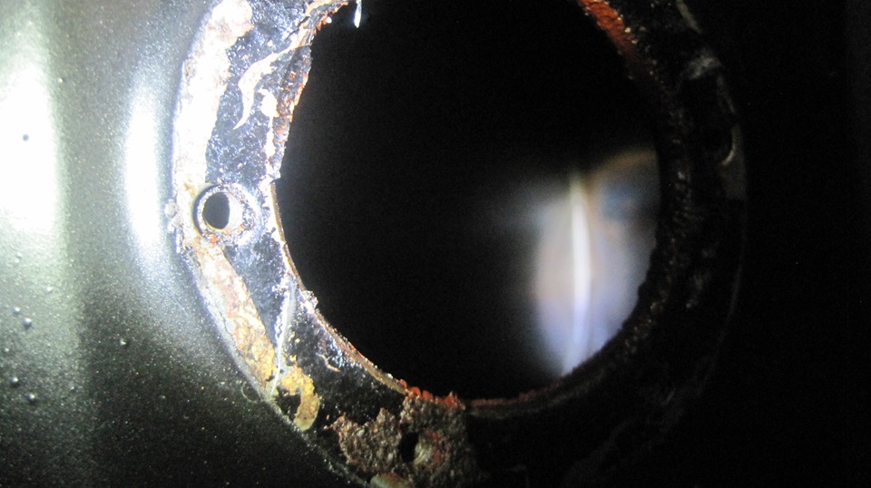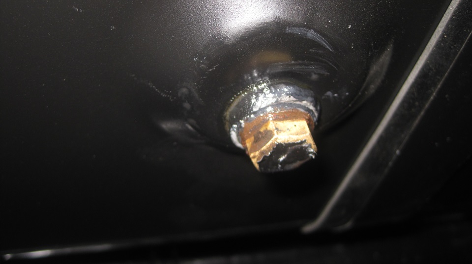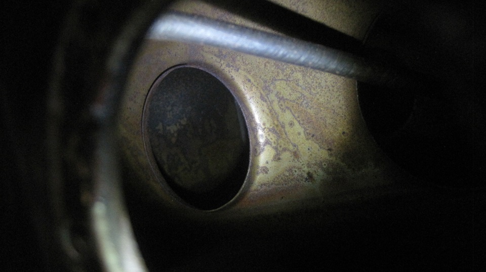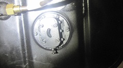The tank looked pretty good inside, some minor surface rust but no serious corrosion or pitting. Even after sand blasting and painting the outside, and rolling it around to dump out as much fluid as possible, there was still some evil turpentine smelling stale juice in there. So we pulled the bottom plug just long enough to drain the remains.