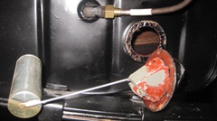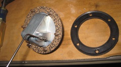 The new Moss Motors Classic Gold sender measured good 0 to 80 ohms with smooth transition as it should. We have had good service with these in recent years. The Moss "Premium Viton" gasket ($3.99 please) that came withe the new sender unit is a no-go in my book, because oversize clearance holes allow fuel to leak through the threads and drip off the screw heads. The Moss solution for this issue is to sell you a set of six nylon washers to place under the screw heads to stop the leaks. I suppose it will work, but why? The traditional cork gasket ($0.49 thank you) has slightly undersized screw holes (as original factory issue), so you push the screws through the gasket. When tightened, the cork squashes and constricts on the screws with no leaks and no sealant required. When tightening the screws it is easy to see the cork gasket squishing out around the sides while as it is constricting on the screws. I recon $0.49 cork wins on all counts.