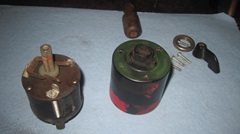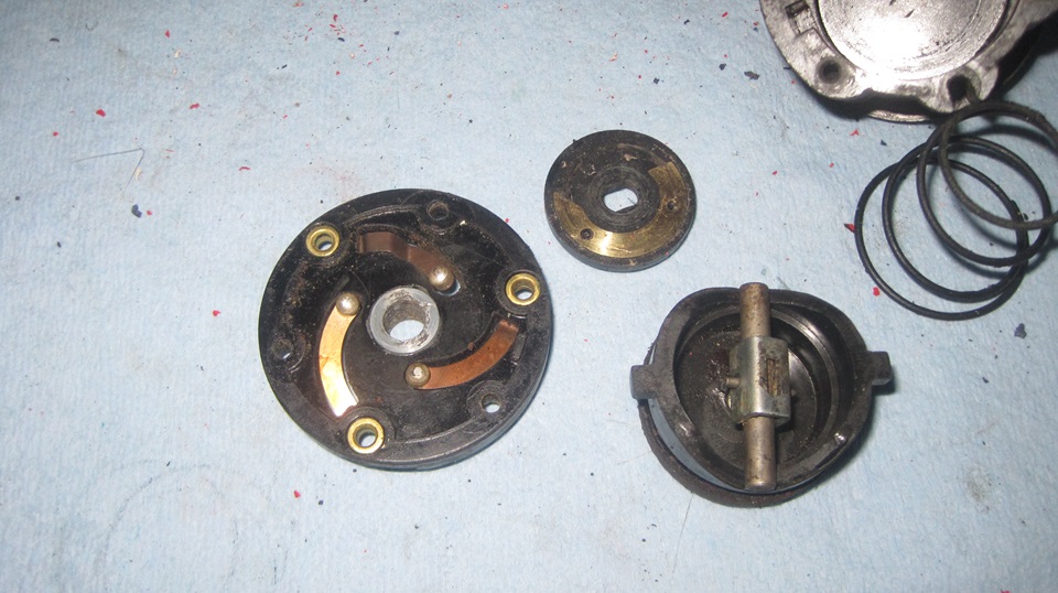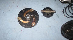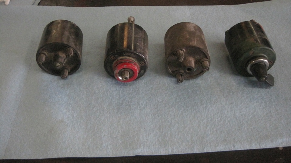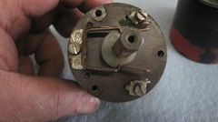 One last work day at Brice Station Vineyards and winery in Murphys, California. We will see what we can do with four non-working MGA time delay turn signal switches. Stu returned home from his eastern family visit trip just as we were getting started, but he had a doctor appointment and had to leave again, missing a lot of the following tinkering fun. -- Laid out at random, call them number1 1 to 4. the one on far right in the first picture is #1, the only one with an operating knob?handle,and the first to be disassembled. Remove the knob, bezel nut, three screws, and pull off the front cover. This one has the cam operated switch contacts with which I am most familiar. As long as the spring arms are not broken, these usually work okay electrically. In fact you almost never need to clean the contacts, because they have wiping contact motion and are generally self-cleaning.